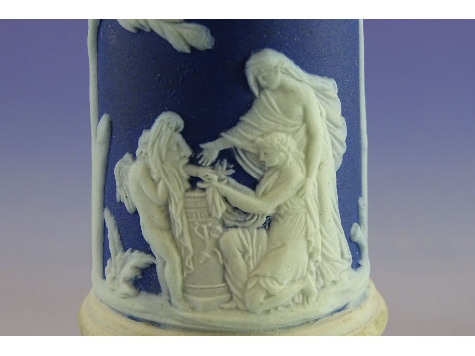 Hibátlan állapotú, jelzett, gyönyörű kék alapmázon plasztikus fehér mitológiai díszítésű porcelán gyertyatartó párban