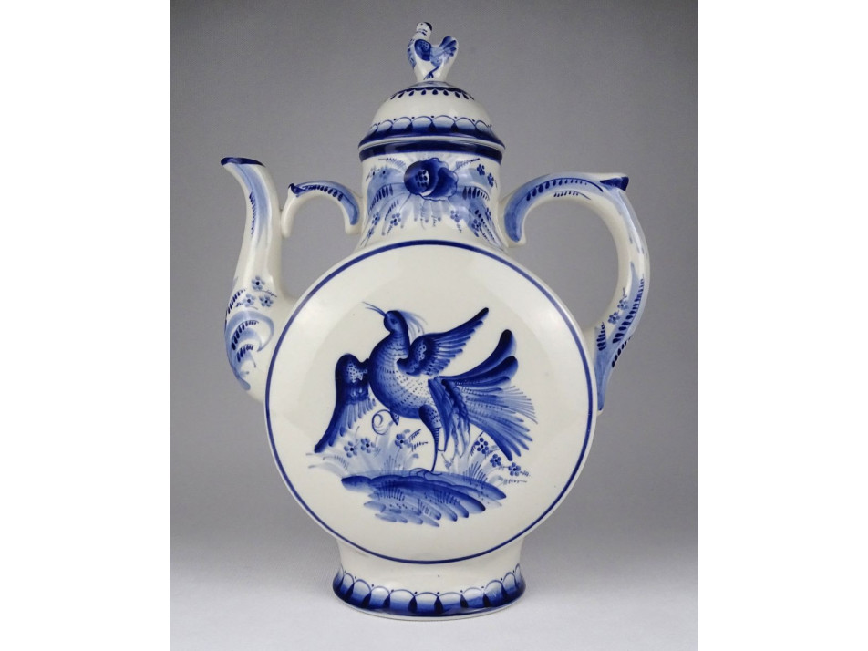 Hibátlan állapotú, nagy méretű, kézi festéssel díszített porcelán kancsó, kiöntő. Hatalmas méretű teáskancsó. Mindkét oldalát nagy méretű madár kék festés, fedelét plasztikus tyúk vagy kakas díszíti.