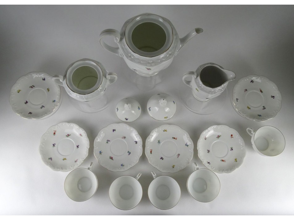 Régi, szép állapotú, Csehszlovák porcelán teáskészlet, apró virág mintákkal díszítve.
