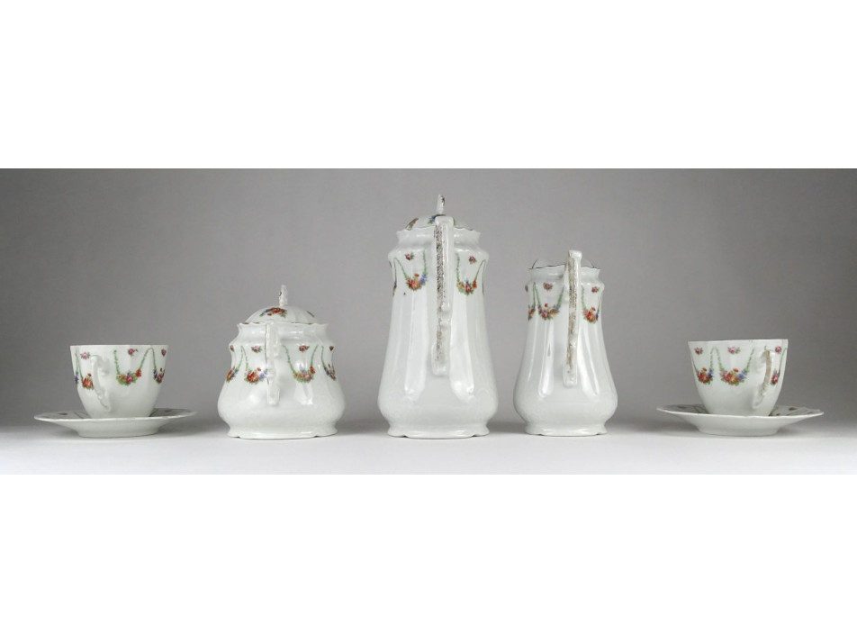 Régi aranyozott, virágdíszes porcelán teáskészlet, az 1900-as évek elejéről.