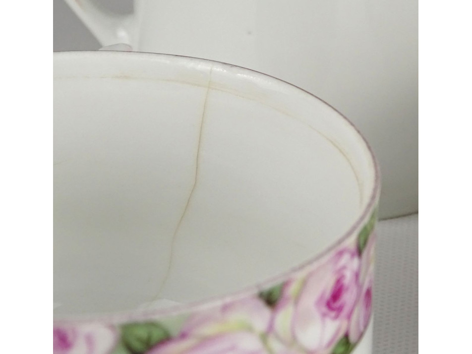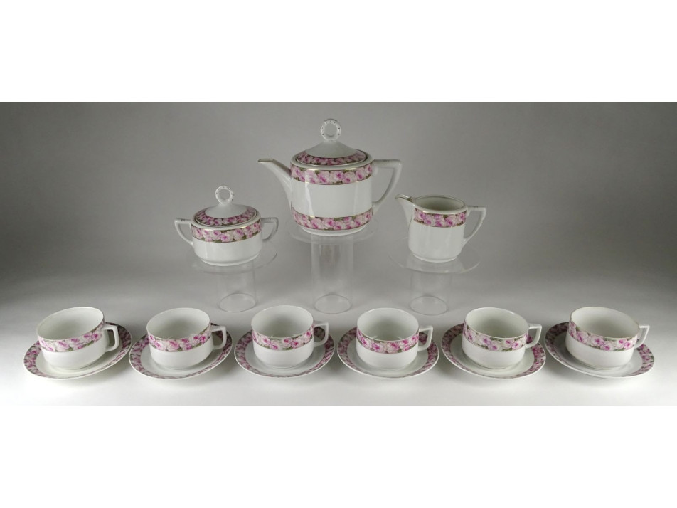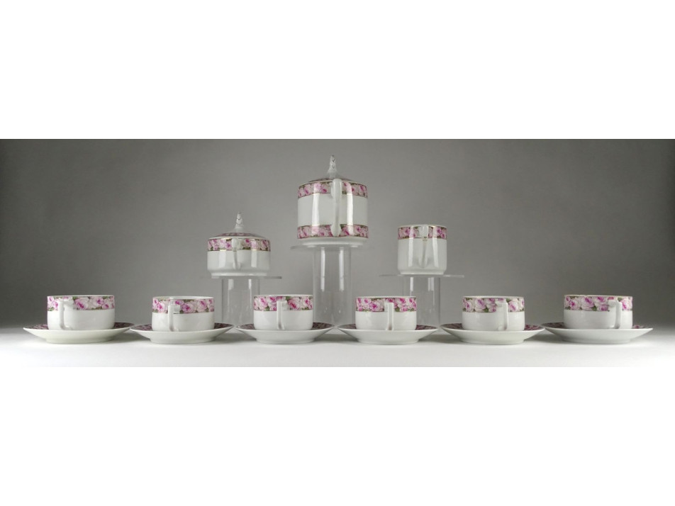 Régi szép állapotú, rózsaszín virág mintás, rózsadíszes porcelán teáskészlet aranyozott szegéllyel.