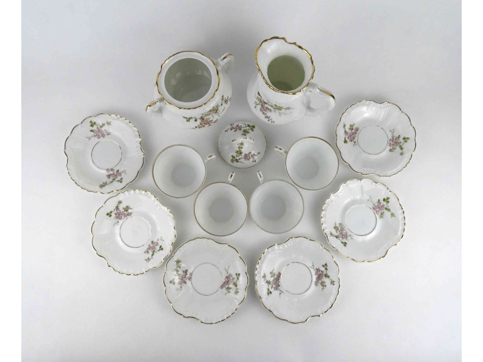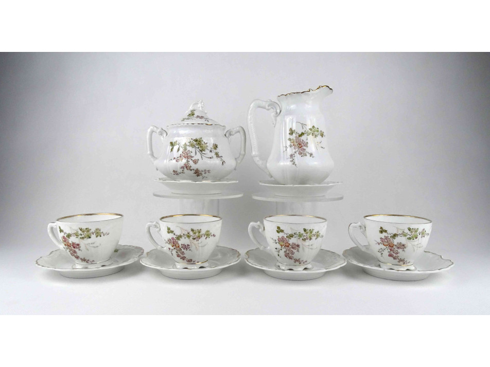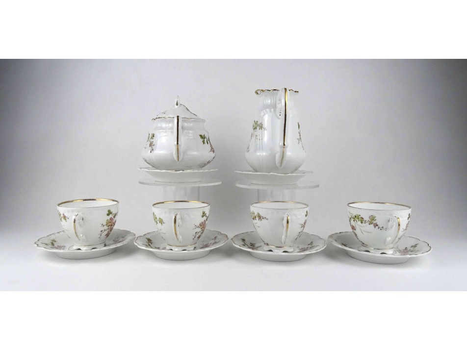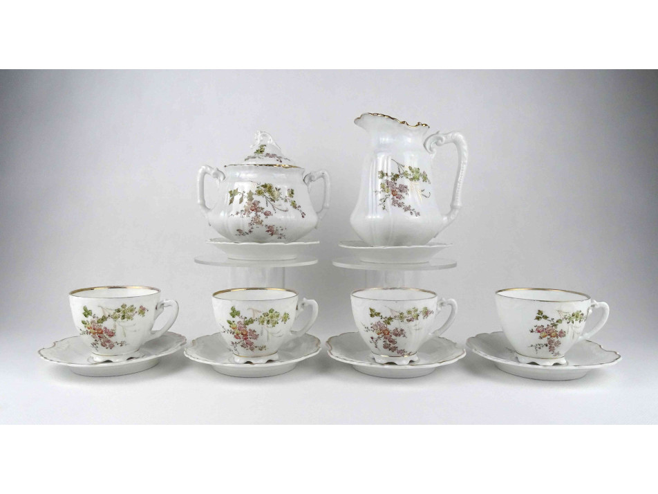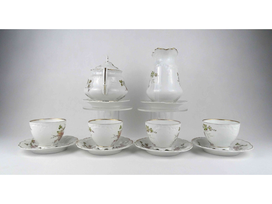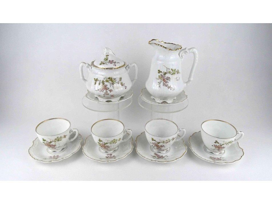 Antik, hibátlan állapotú, jelzett, vékonyfalú német Pfeiffer & Löwenstein porcelán teáskészlet az 1900-as évek első feléből. Rajta aranyozás és virágdíszítés.