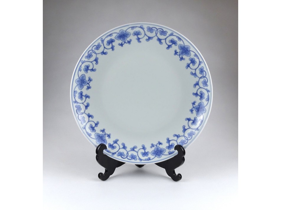 Régi, hibátlan állapotú, hatalmas kék-fehér, virágokkal és indákkal díszített, jelzett porcelán tál, tálca, tányér.