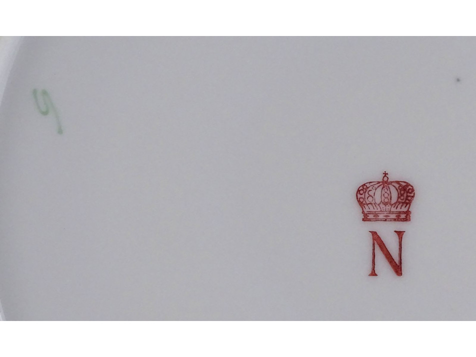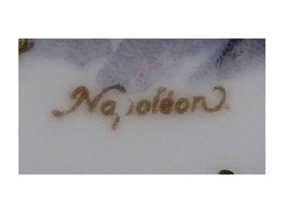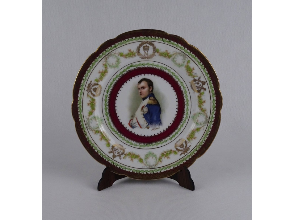 Gyönyörű, gazdagon aranyozott jelzett porcelán tányér, dísztányér. Közepén férfi portré, Napóleon portré. A tányér peremén aranyozott babérkoszorús koronás díszítések láthatók. A táynéron hajszálrepedés található.