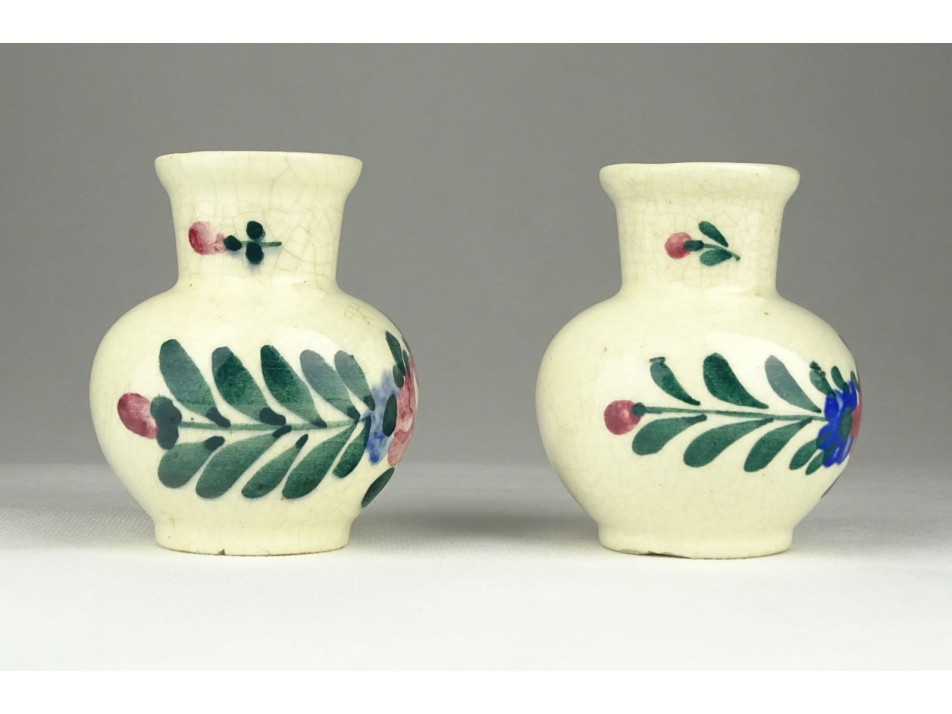 Antik, hibátlan állapotú, kisméretű, kézifestett fajansz ibolyaváza párban.