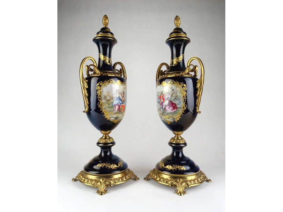 Aranyozott réz veretes kobaltkék SEVRES ALTWIEN jellegű urnaváza pár 45 cm
