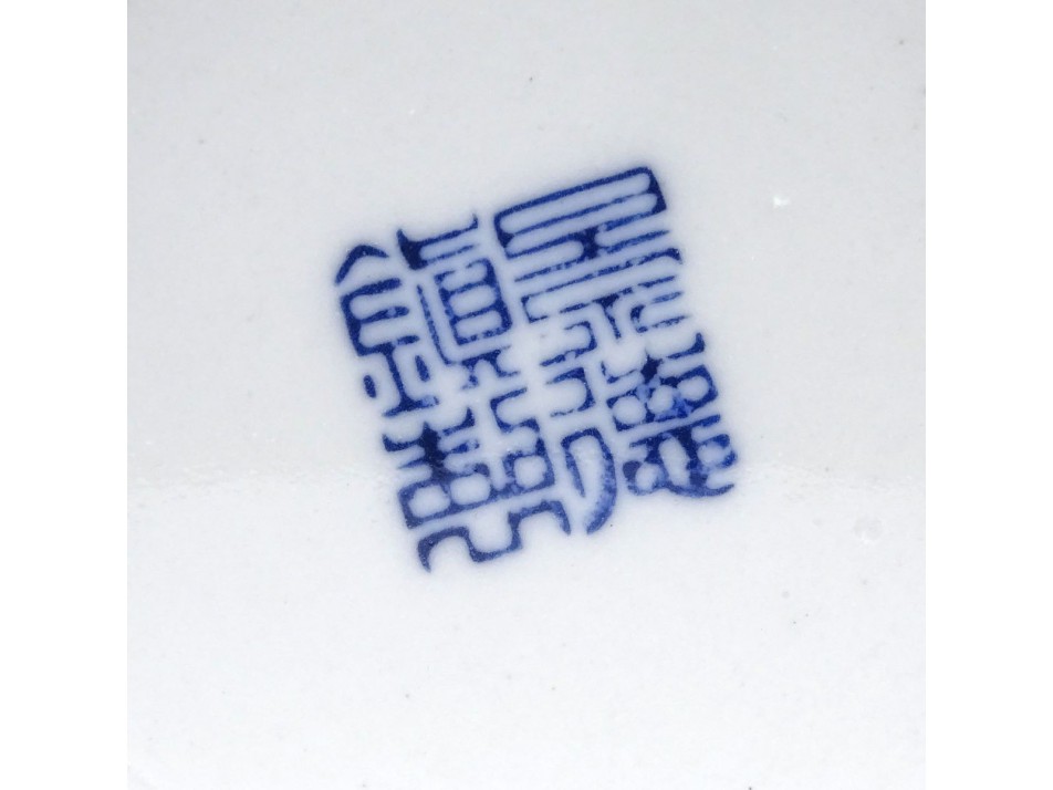 Régi, kék-fehér, virágokkal és indákkal gazdagon díszített, jelzett, Jingdezhen porcelán váza. Szájánál apró hajszálrepedés látható.