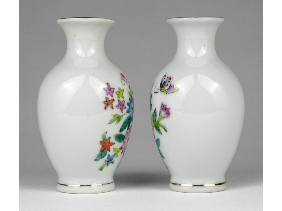 Régi, hibátlan állapotú kis méretű kínai porcelán váza pár, ibolyaváza párban. Oldalán kézzel festett virág és pillangó díszítés látható.
