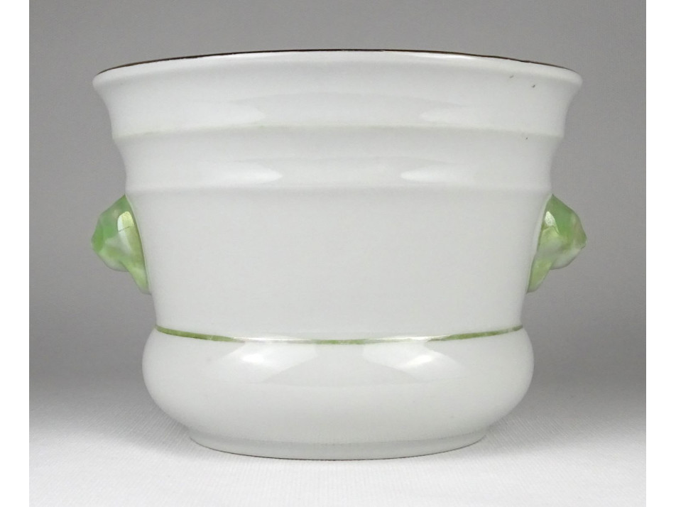 Régi, hibátlan állapotú porcelán kaspó. Szélén arany szegéllyel és két oldalán plasztikus oroszlán fej díszítéssel.