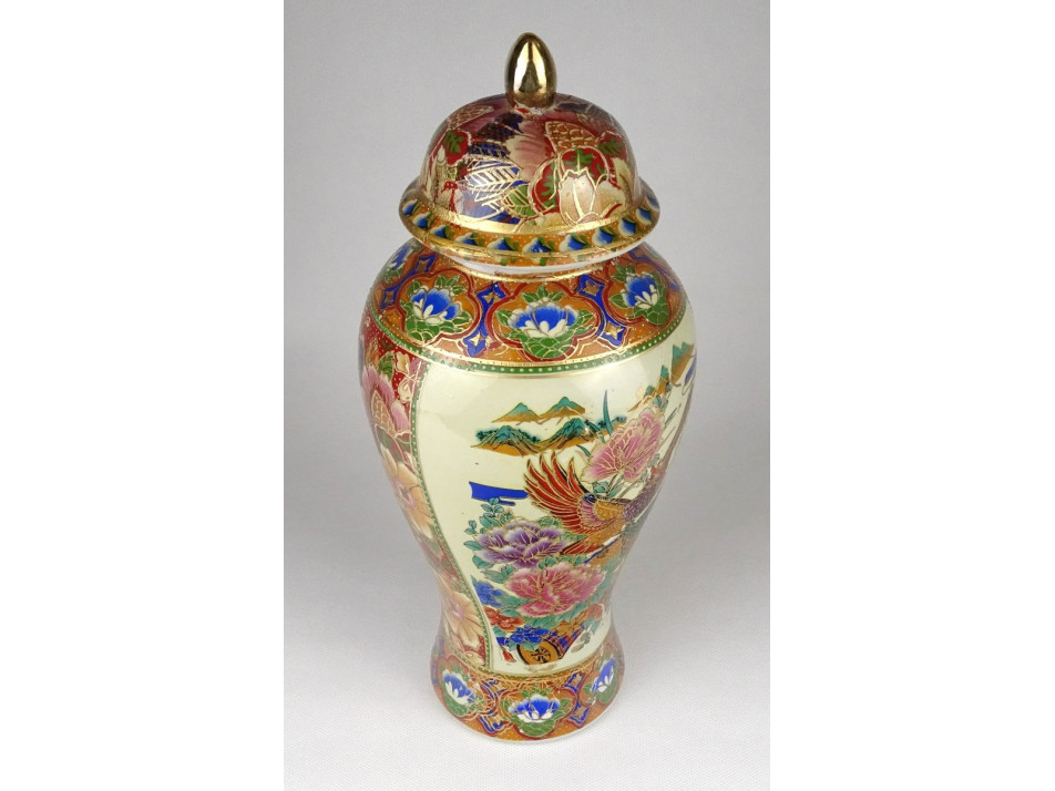 Hibátlan állapotú, aranyozott fedeles porcelán váza, kínai urnaváza. Oldalán körben gazdag madaras, pillangós, virágos díszítés.