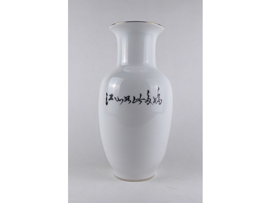Régi, hibátlan állapotú, kézifestésű sziklás hegyi tájképpel és kínai írásjelekkel díszített, kínai porcelán váza.