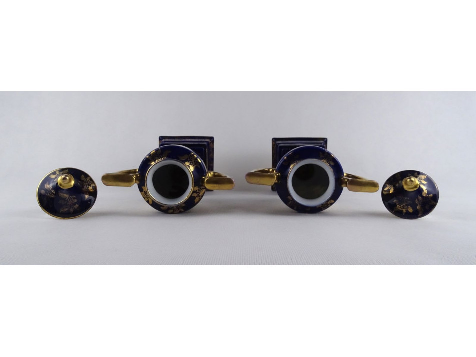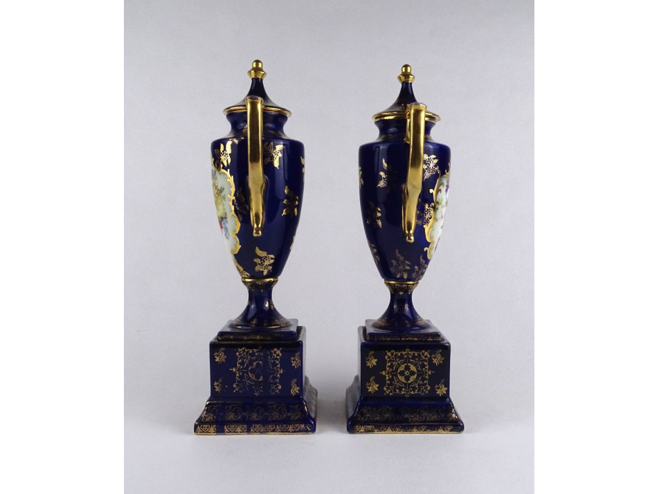 Hibátlan állapotú, gyönyörű kobaltkék színű, gazdagon aranyozott jelzett, virágdíszes osztrák porcelán váza, vázapár. Fedeles urnaváza, párban.