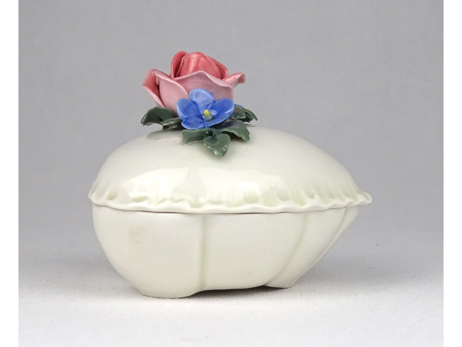 Hibátlan állapotú, barokkos formájú szív alakú, tetején rózsa fogantyús ENS porcelán bonbonier, ékszertartó. A rózsaszirmokon egy-két apró lepattanás található, alig észrevehető.