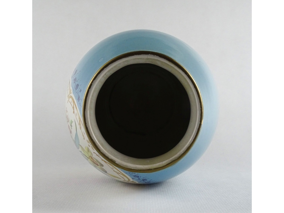 Antik, nagy méretű, hibátlan állapotú, duplán jelzett fajansz váza, díszváza. Aranyozott, kézi festéssel gazdagon díszített, ritka, nagy méretű váza.