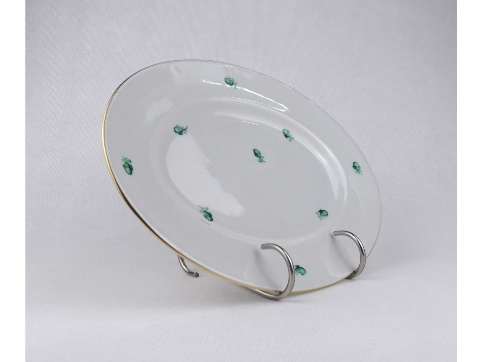 Régi, jelzett, zöld apró virág mintás, aranyozott szélű, ovális Herendi porcelán kínálótál, asztalközép.