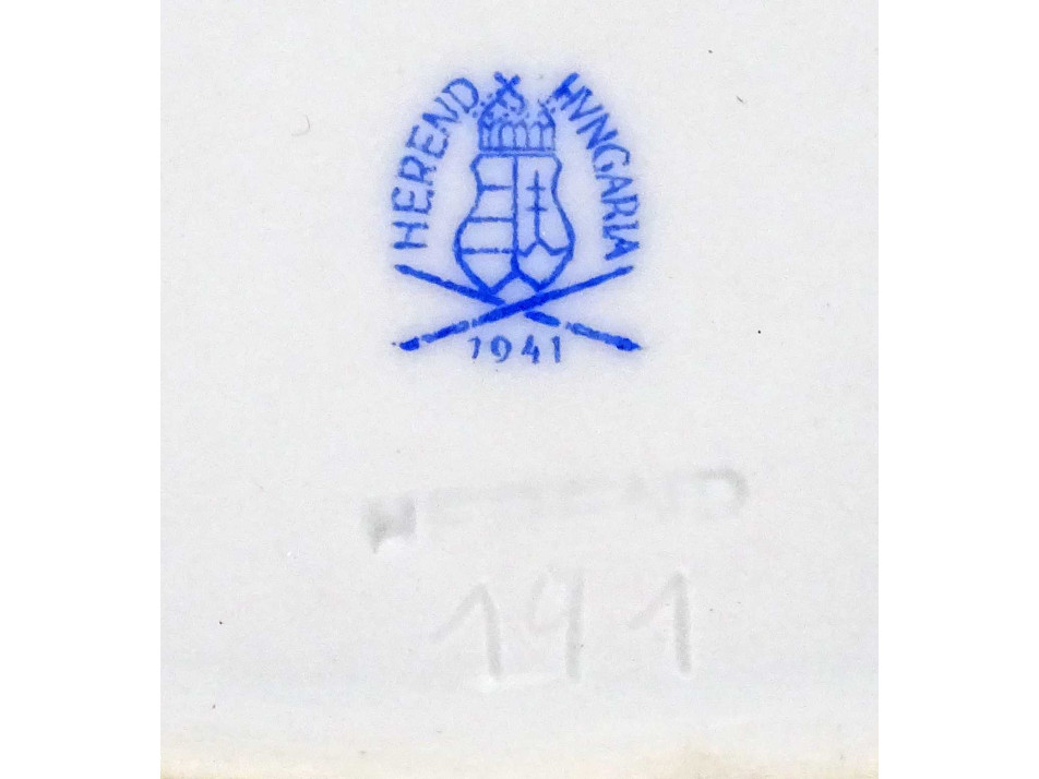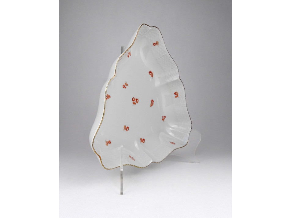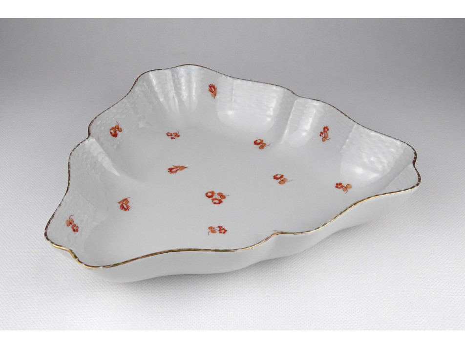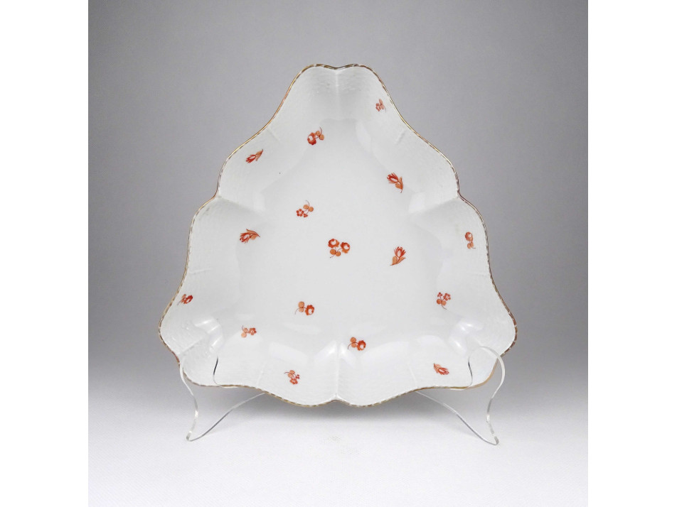 Régi, hibátlan állapotú, aranyozott szélű, narancssárga apró virágmintás, háromszög alakú, Herendi porcelán tésztás tál, kínáló tál. A tál pereme restaurátor álta szakszerűen javított.