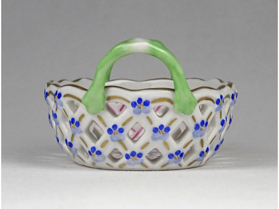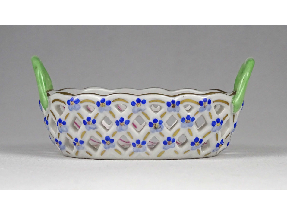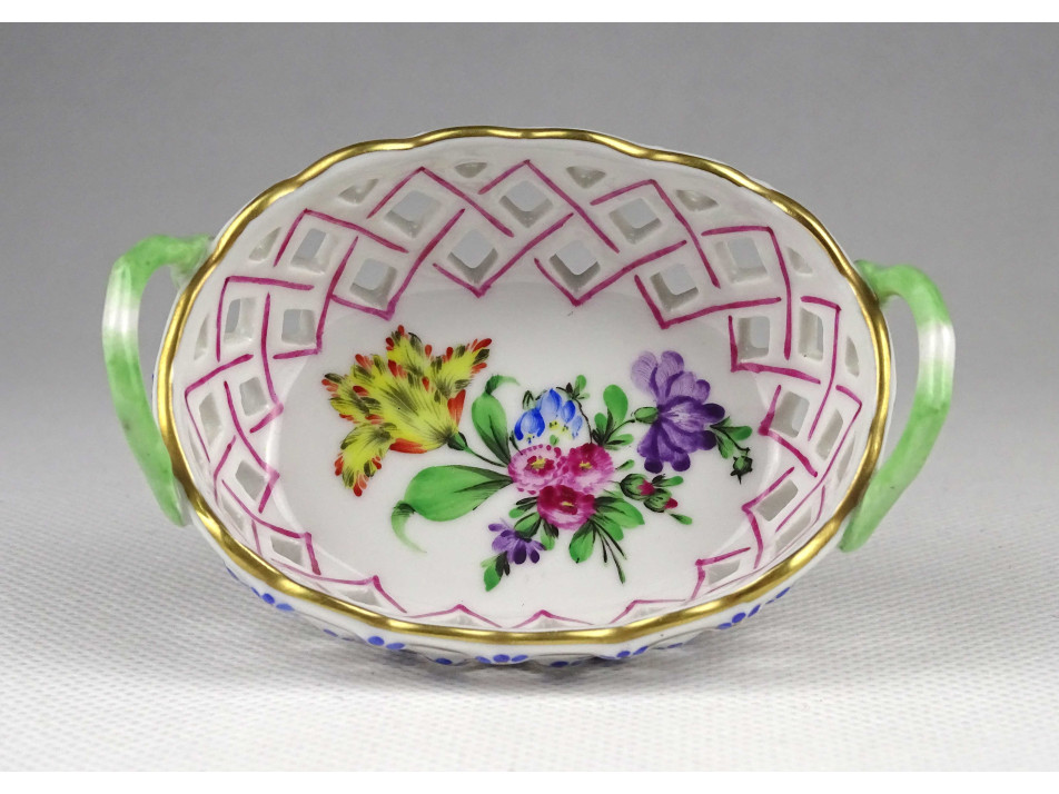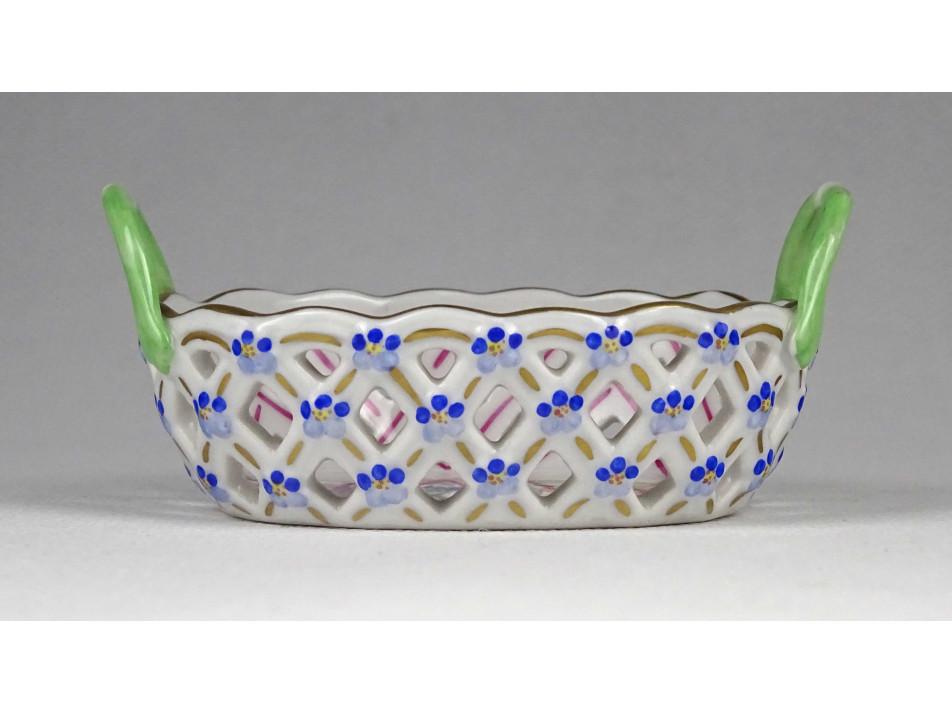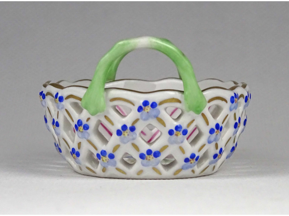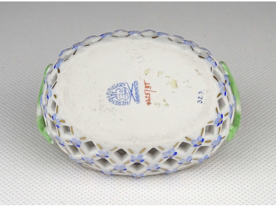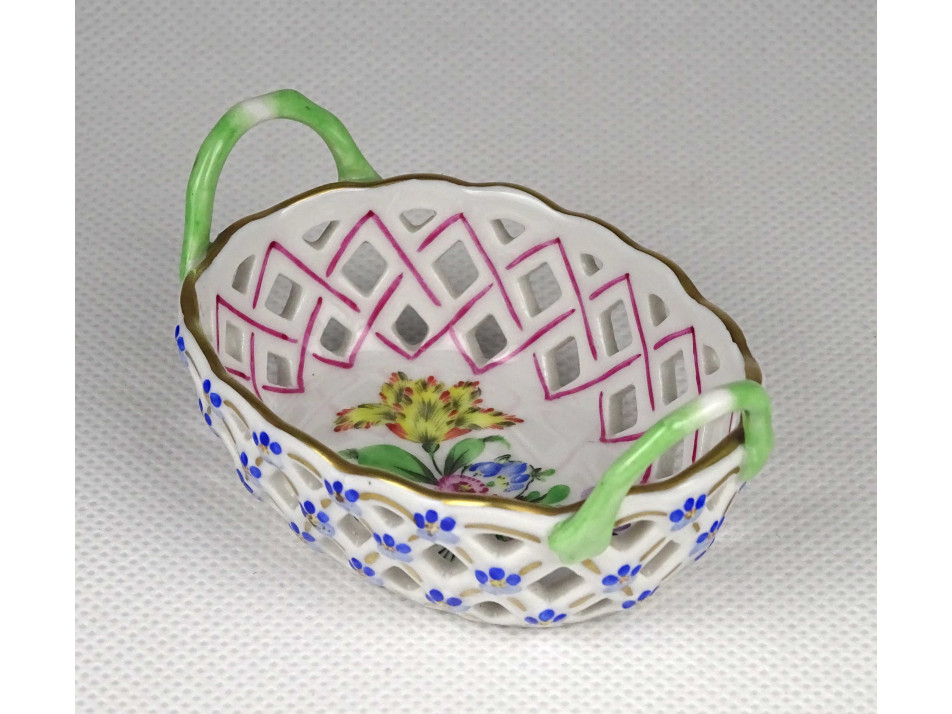 Régi, ovális alakú, kisméretű Herendi porcelán áttört gyűrűtartó kosárka. Rajta kézzel festett Tulipán csokor (Bouquet de tulipe) díszítés.