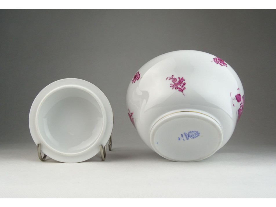 Hibátlan állapotú, jelzett, aranyozott, kézzel festett, nagyméretű, lila Apponyi mintás Herendi porcelán bonbonier. Tetején plasztikus rózsa dísz látható.