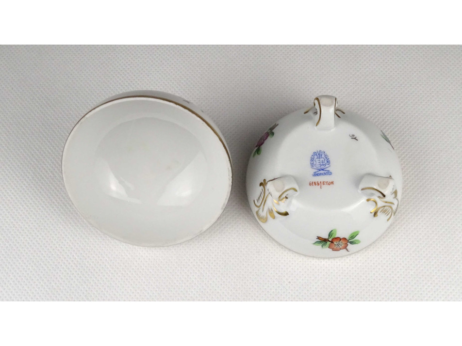 Hibátlan állapotú, három lábon álló, rózsa fogantyús, eton mintás Herendi porcelán bonbonier.