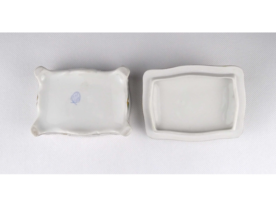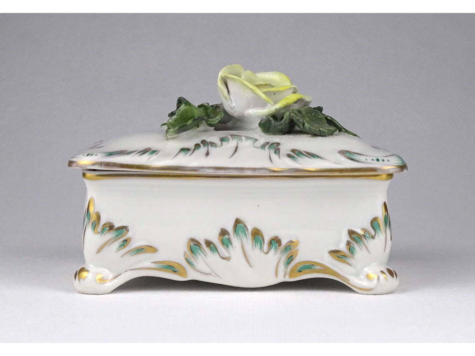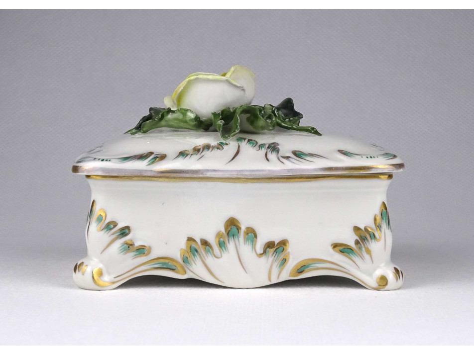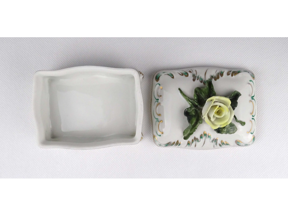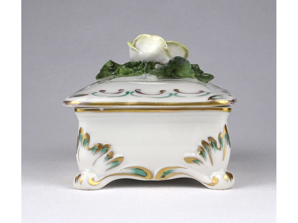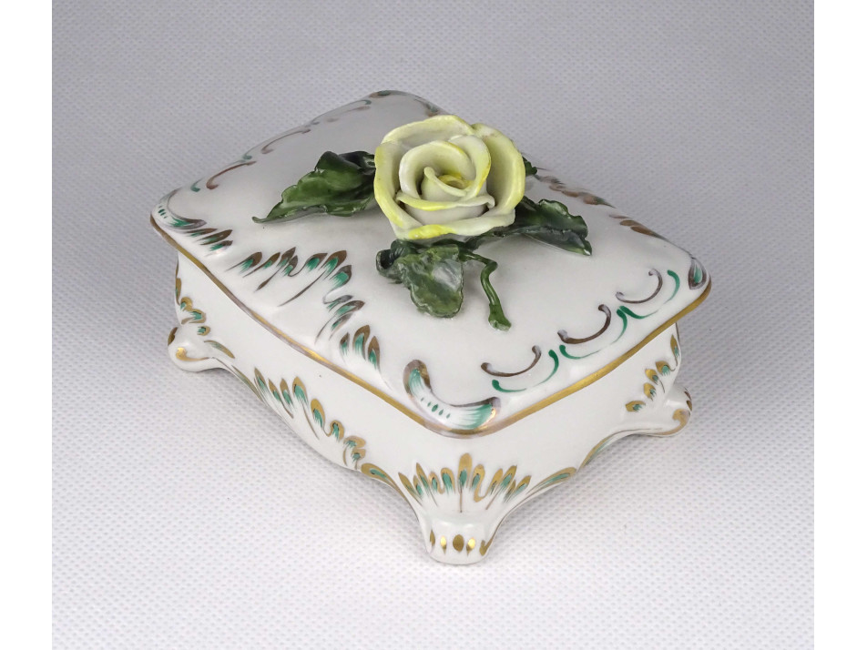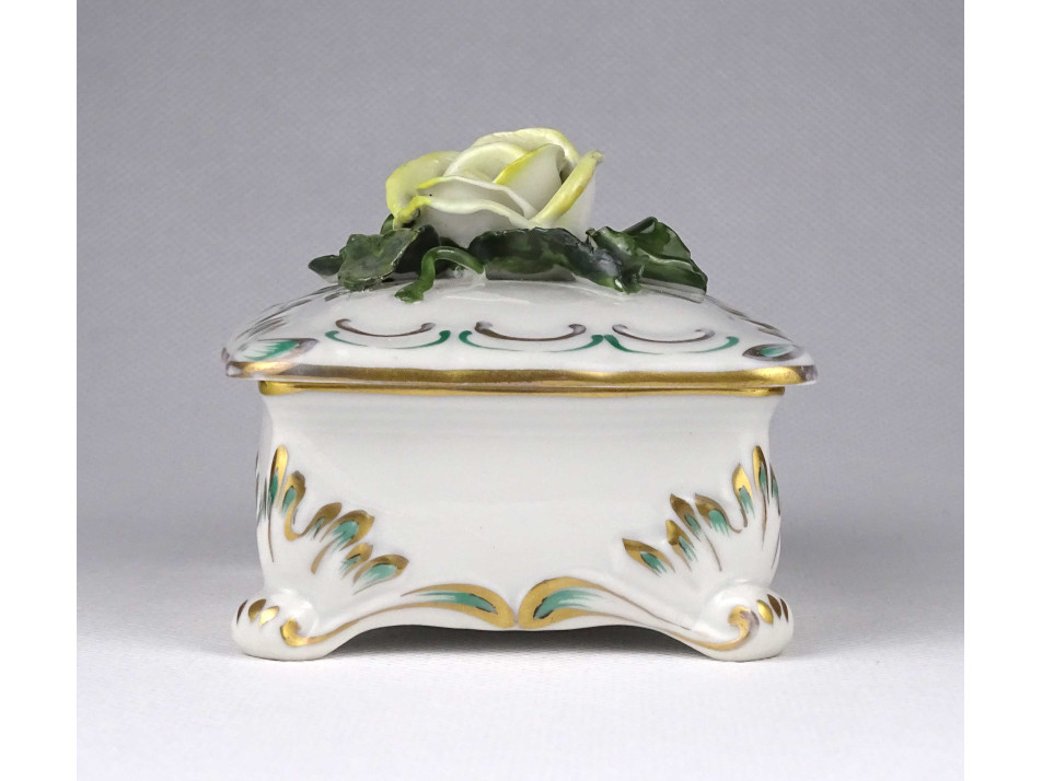 Régi, hibátlan állapotú, aranyozott díszítésű, plasztikus sárga rózsa fogantyús, szögletes alakú Herendi porcelán gyűrűtartó, bonbonier. A rózsa szirma és levelei restaurátor által szakszerűen javítottak.