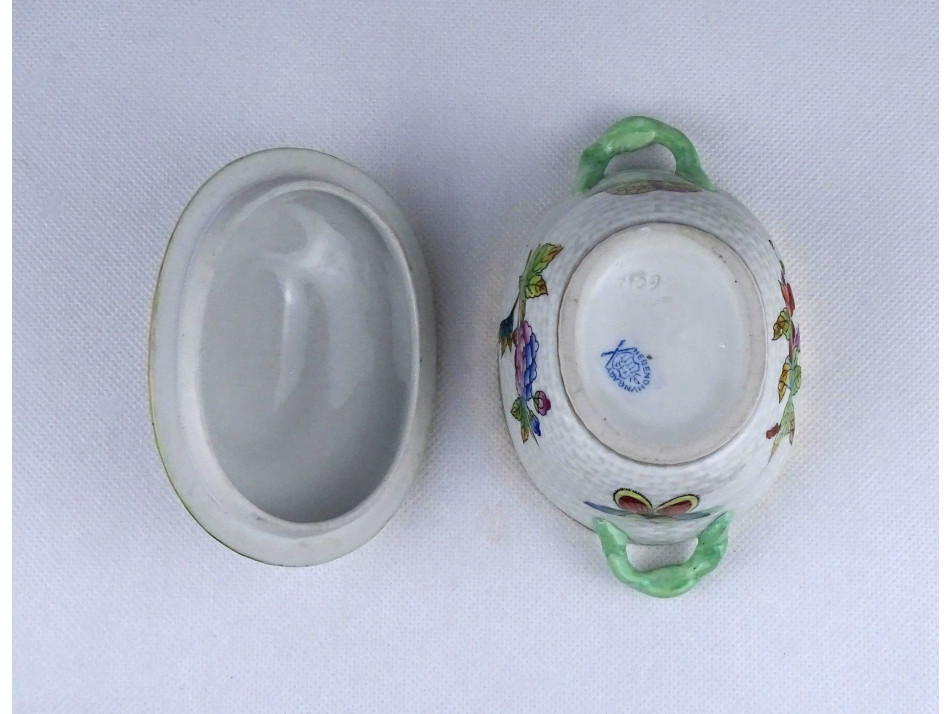 Régi, szép állapotú, Viktória mintás Herendi porcelán bonbonier, tetején hármas rózsa díszítéssel. Fülei restaurátor által szakszerűen javítottak.