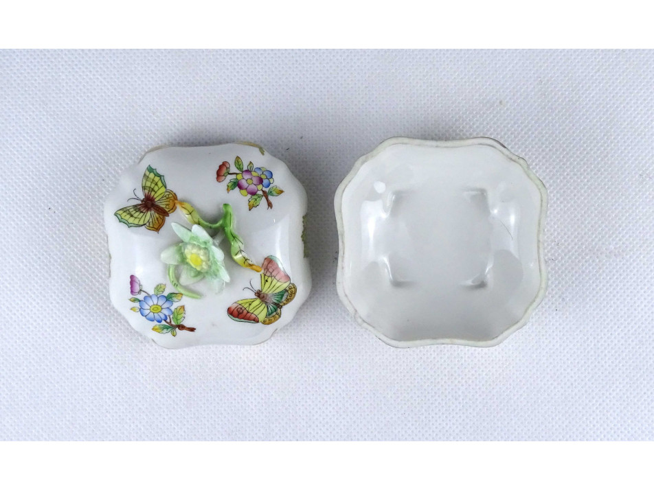 Hibátlan állapotú, nyolcszög alakú, négy kis lábon álló, viktória mintás Herendi porcelán bonbonier, tetején plasztikus virág díszítéssel. A virág szirmai közűl három restaurátor által szakszerűen javított.