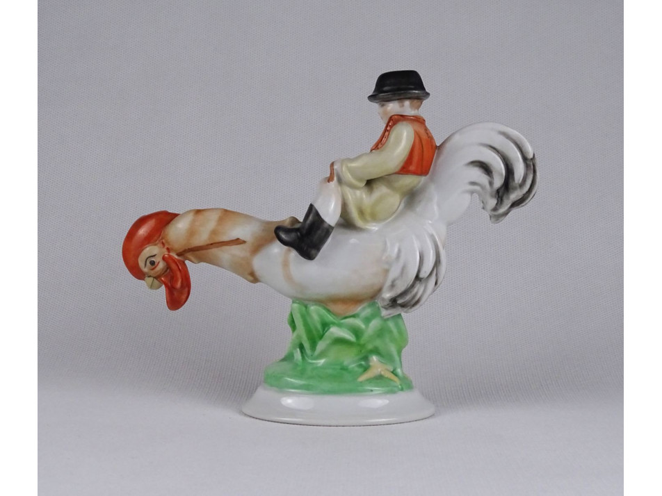 Hibátlan állapotú, régi, kézi festéssel díszített Kakas Marci porcelán figura.