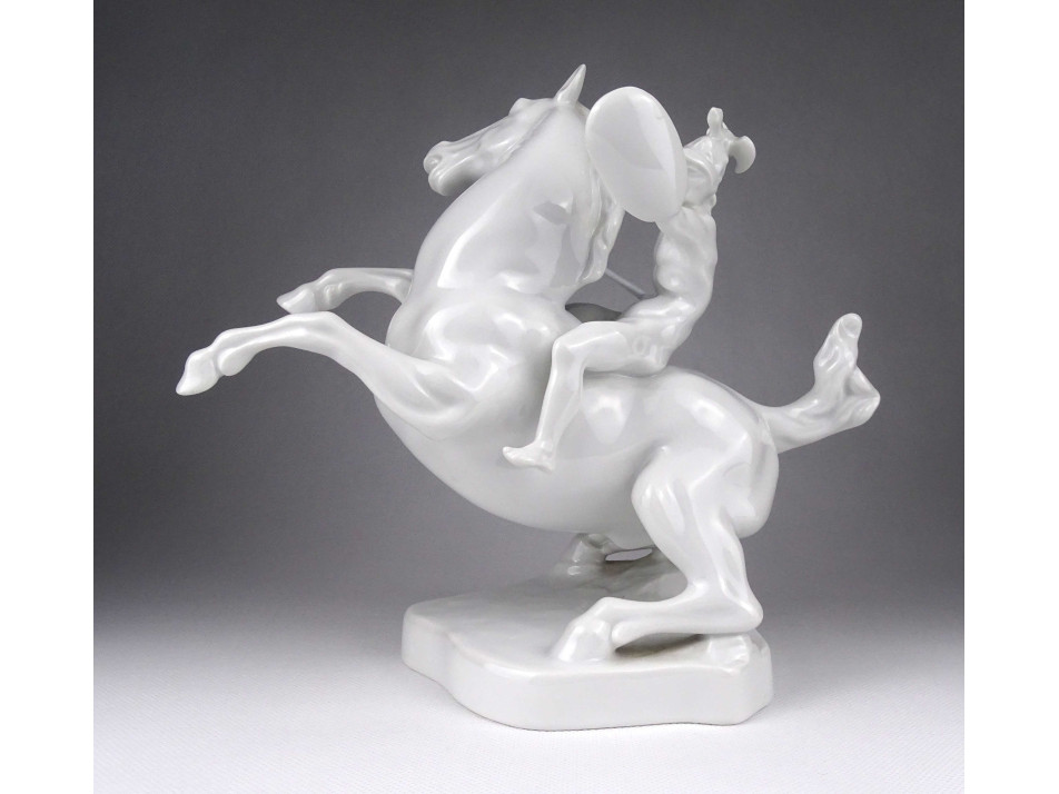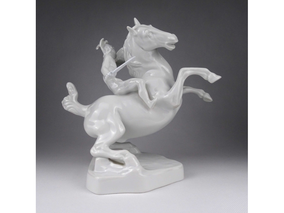 Régi, festetlen, talapzaton álló Herendi porcelán figura, Leonardo da Vinci lovasszobra. A lovas kardja restaurátor által szakszerűen javított.