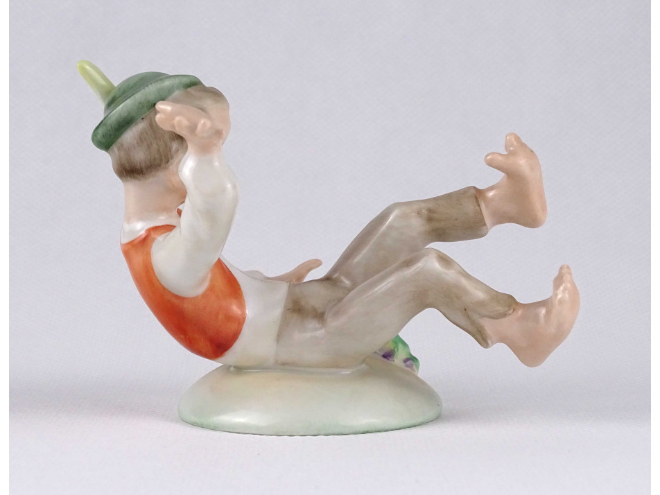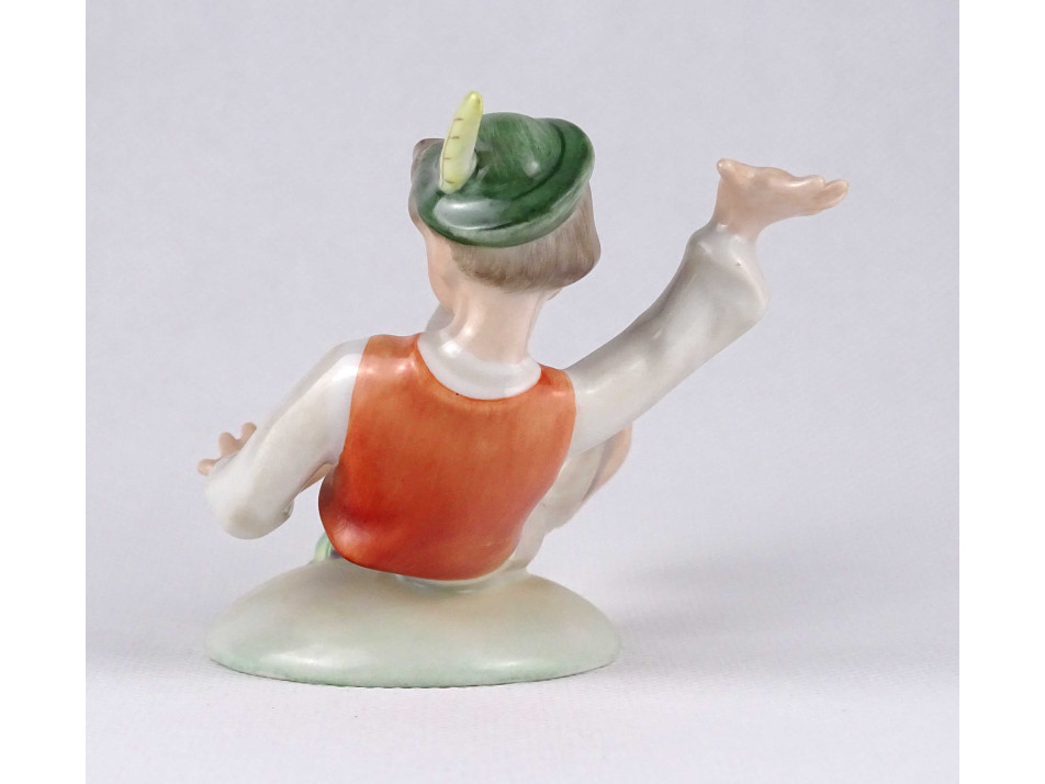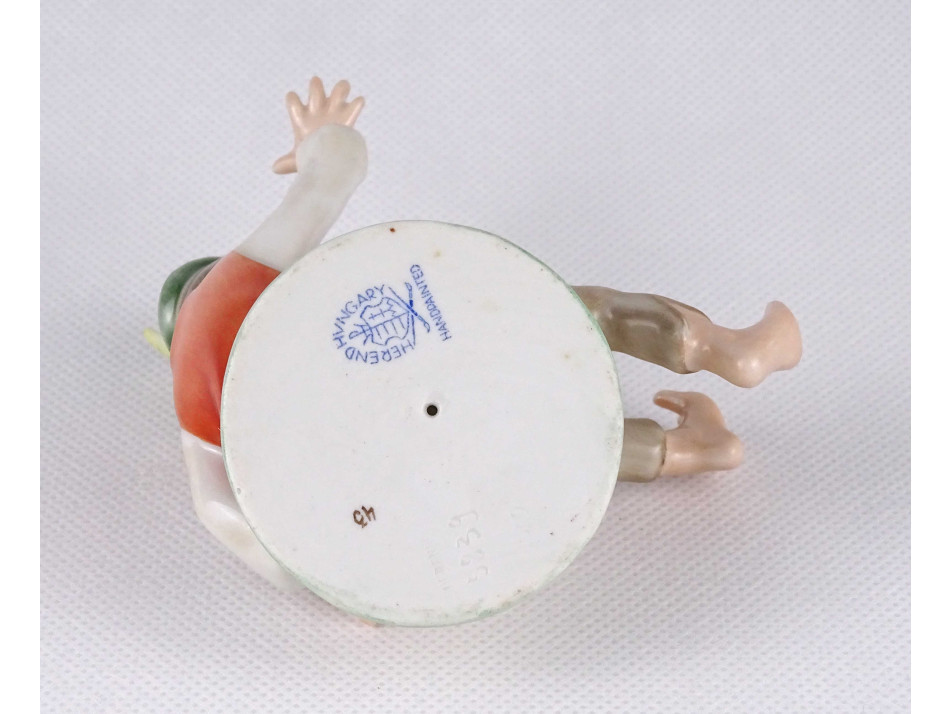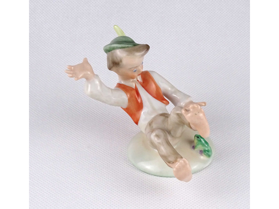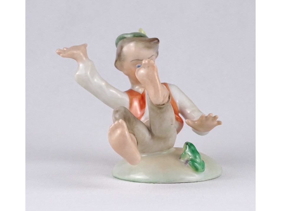Régi, hibátlan állapotú, kézi festéssel díszített Herendi porcelán figura, tollas kalapos ijedt fiú békával.