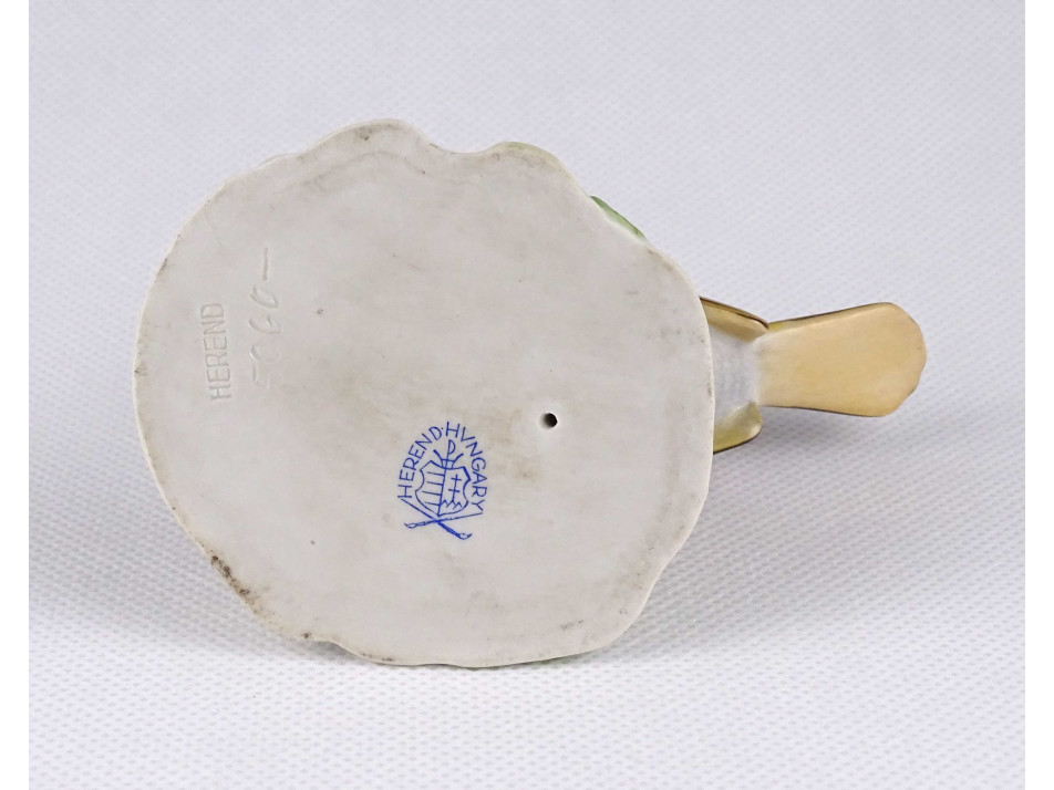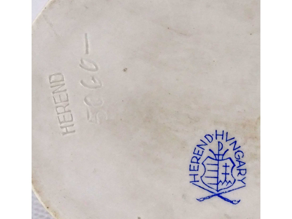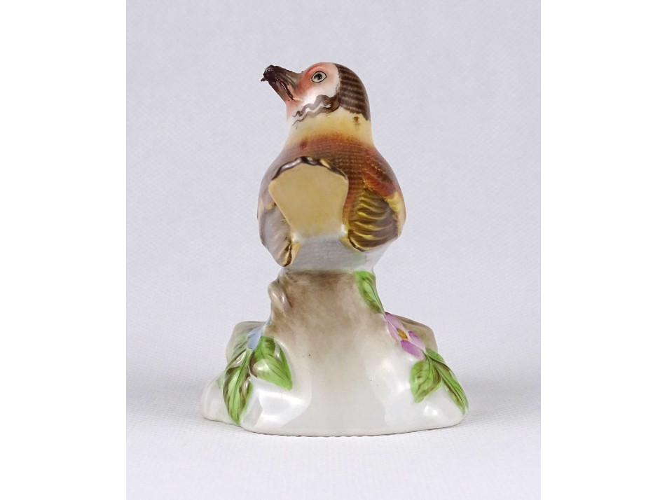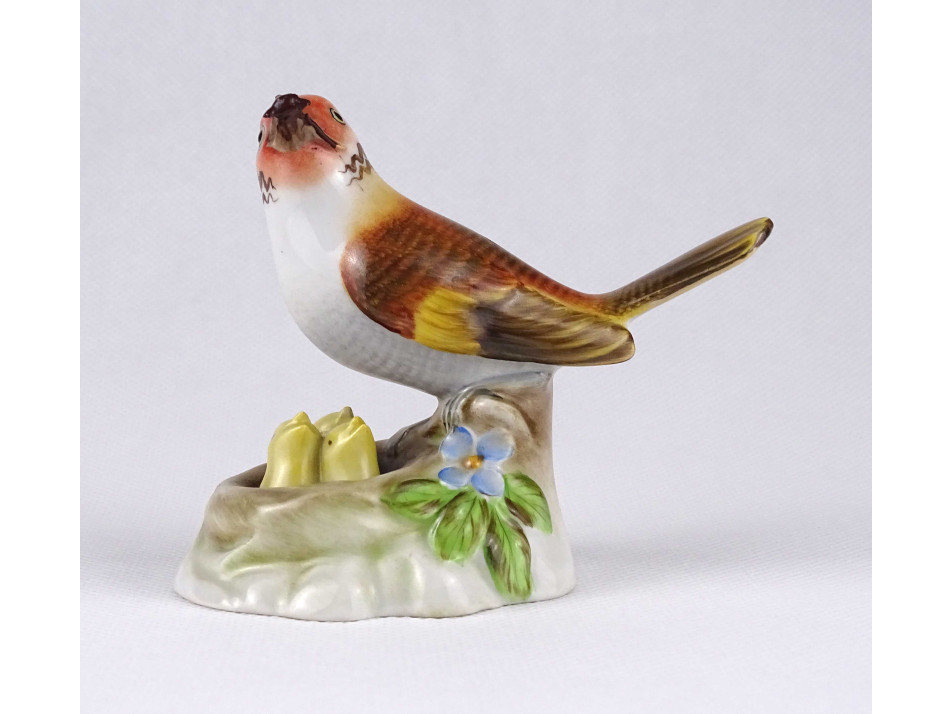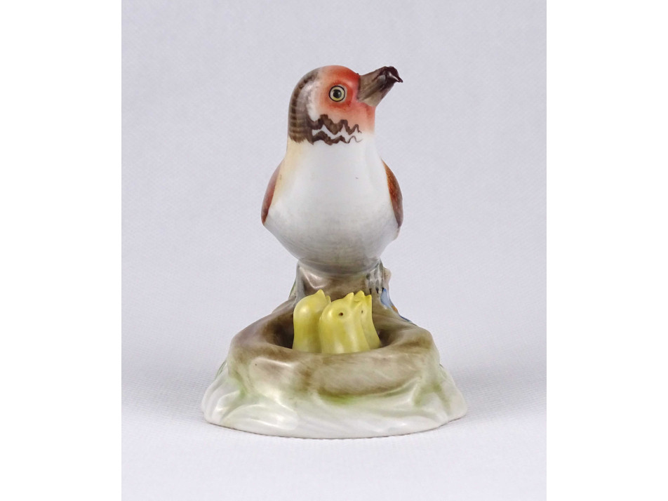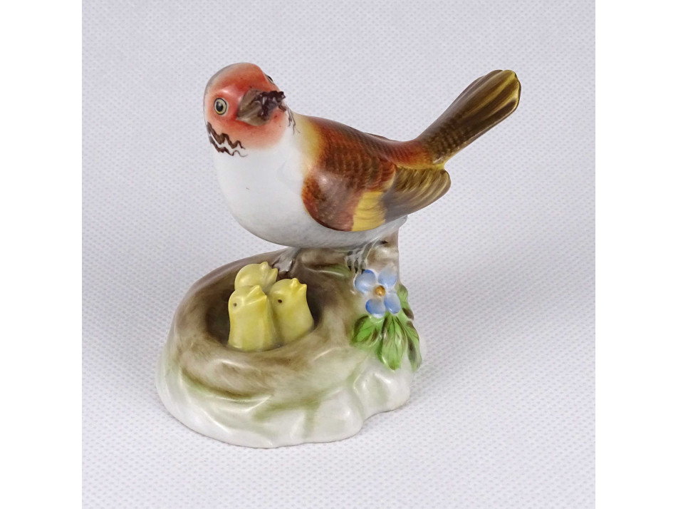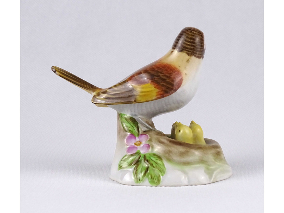 Régi, Herendi porcelán figura, szájában kukacot tartó kismadár, fészke szélén 3 fiókájával. A madár csőrében lévő kukac javított.