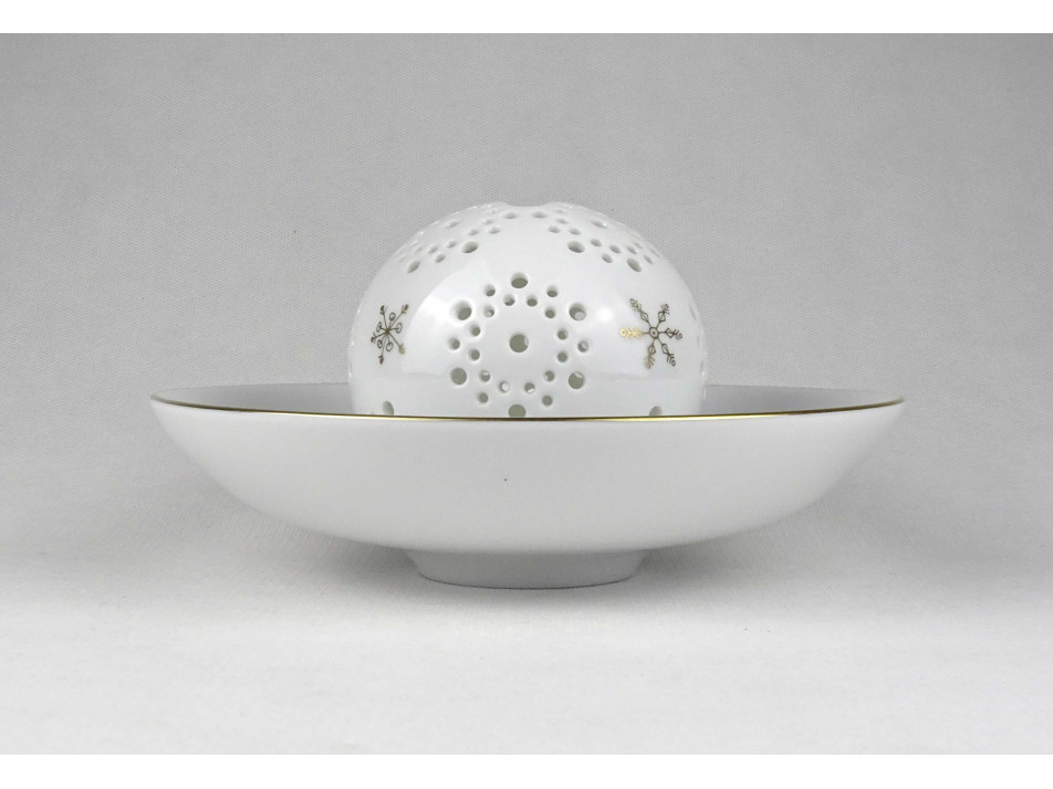 Hibátlan állapotú fehér Herendi porcelán mécsestartó, áttört mintákkal és aranyozással díszített porcelán gömb hozzá illő alátét tányérral. A gömb és a tányér is külön jelzett.