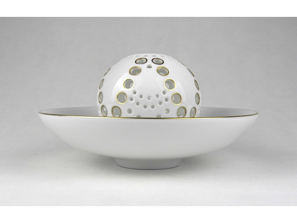 Hibátlan állapotú fehér Herendi porcelán mécsestartó, áttört mintákkal és aranyozással díszített porcelán gömb hozzá illő alátét tányérral. A gömb és a tányér is külön jelzett.