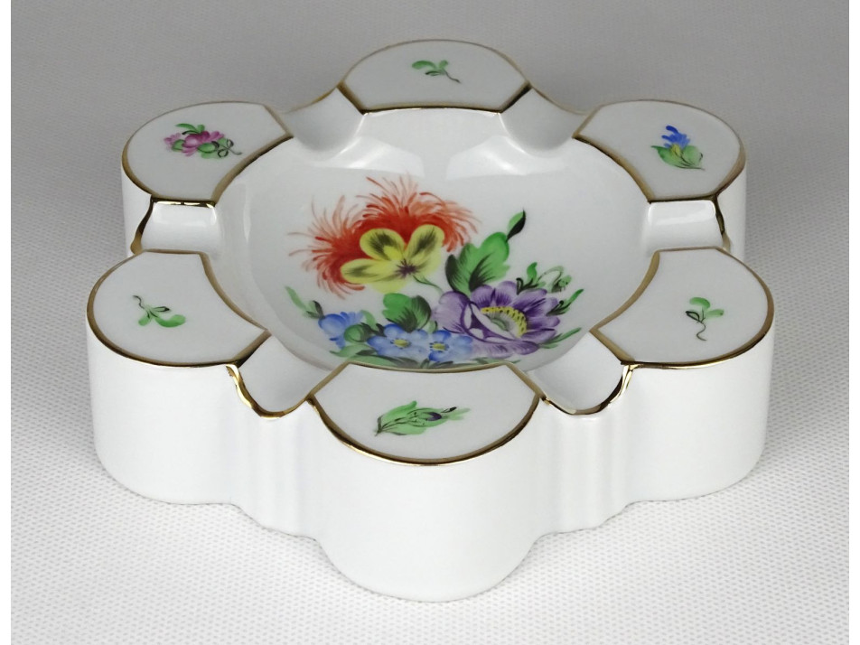 Régi hat állásos, aranyozott szélű, virág mintás, pillangós Herendi porcelán hamutál. Aranyozása is kopásmentes, ajándékozható állapotban van.