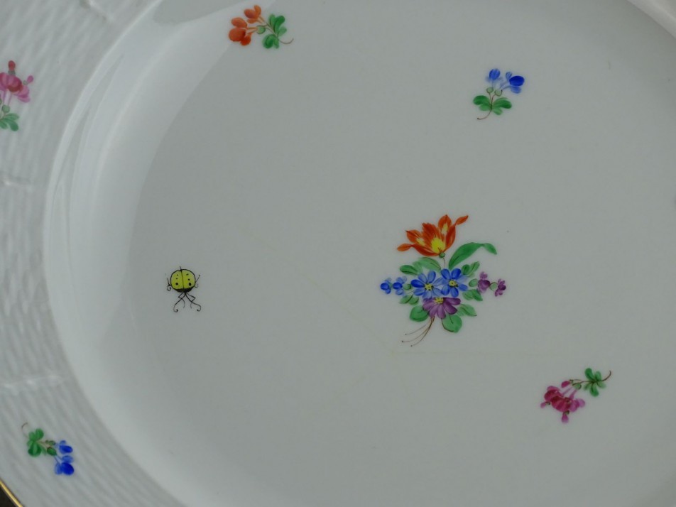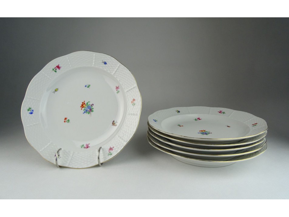 Régi, szép állapotú, jelzett, aranyozott szélű, virág-, bogár- és pillangómintás, Herendi porcelán lapos tányérok.