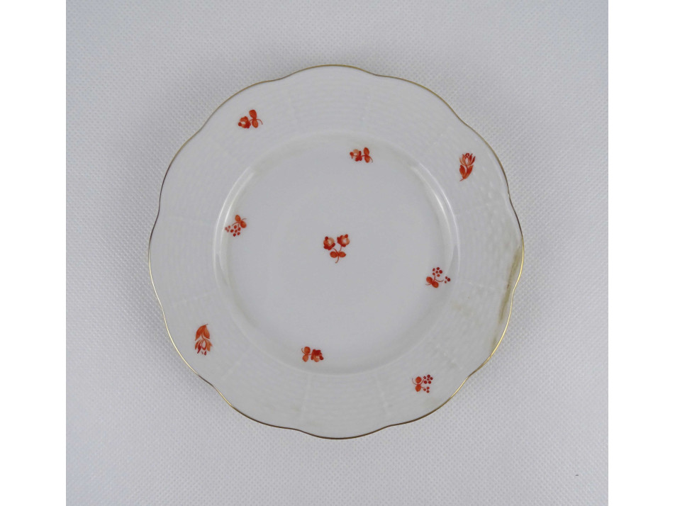 Régi, hibátlan állapotú, 10 személyes, apró narancssárga virág mintás herendi porcelán süteményes készlet, 11 darab.