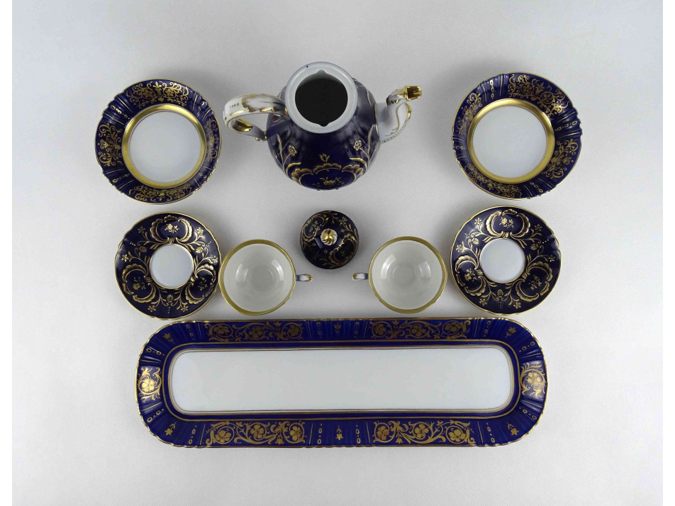 Hibátlan állapotú, két személyes kobaltkék színű, arany mintás Herendi porcelán kávéskészlet. 8 darabos reggeliző készlet.