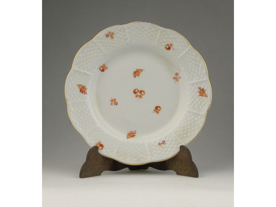 Régi, szép állapotú, jelzett, Herendi porcelán kistányér, piros kézi festésű rózsa díszítéssel, arany szegéllyel.