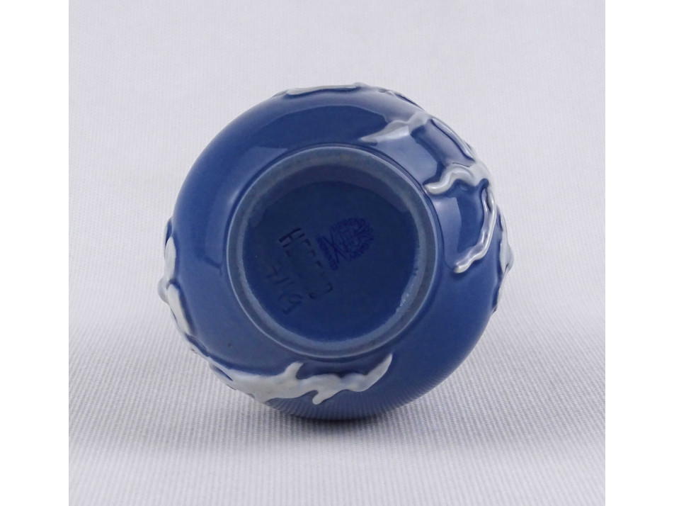 Ritka kék színű fehér virágmintás - pate sur pate - Herendi porcelán váza 15.6 cm