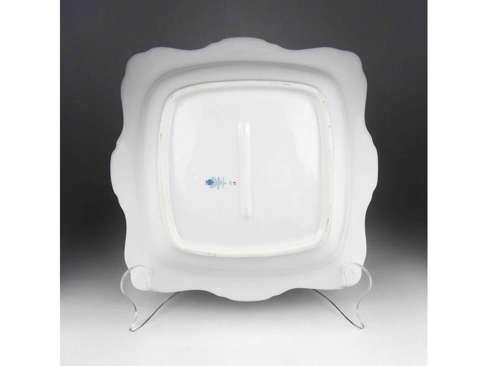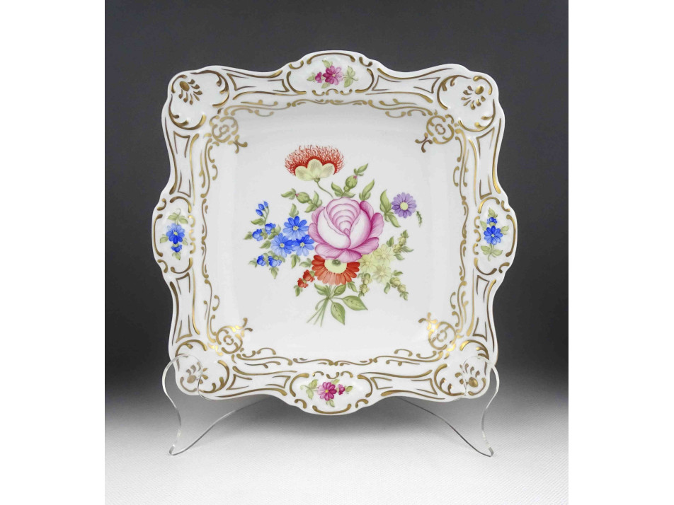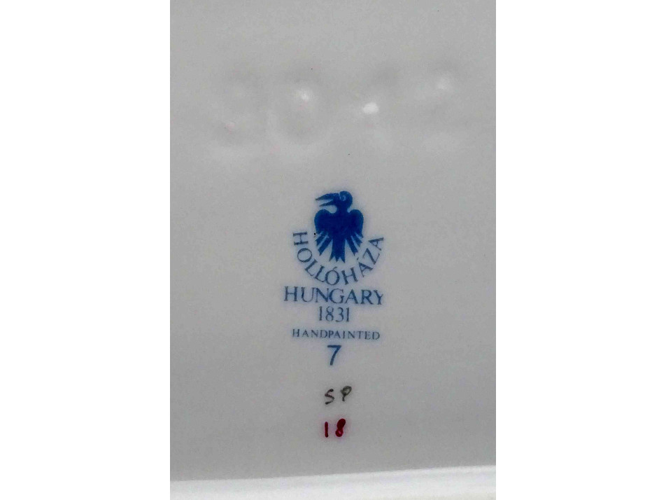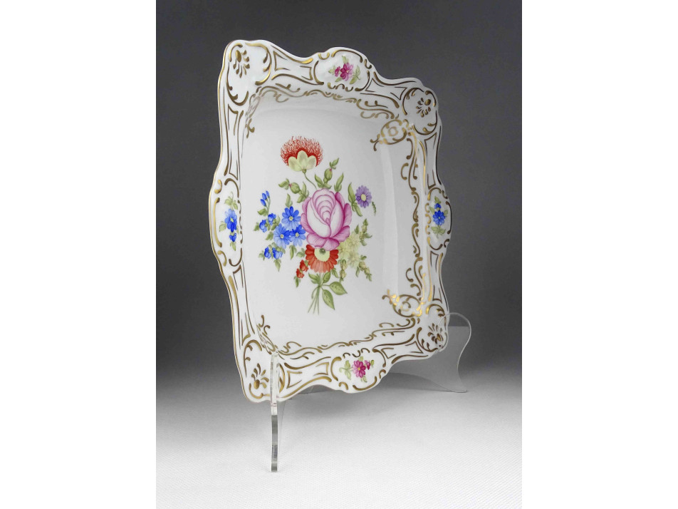 Hibátlan állapotú, gazdagon aranyozott, kézi festéssel díszített, négyszög alakú, Hollóházi porcelán asztalközép, kínáló tál, gyümölcskínáló. Aranyozása kopásmentes, ajándékba adható!