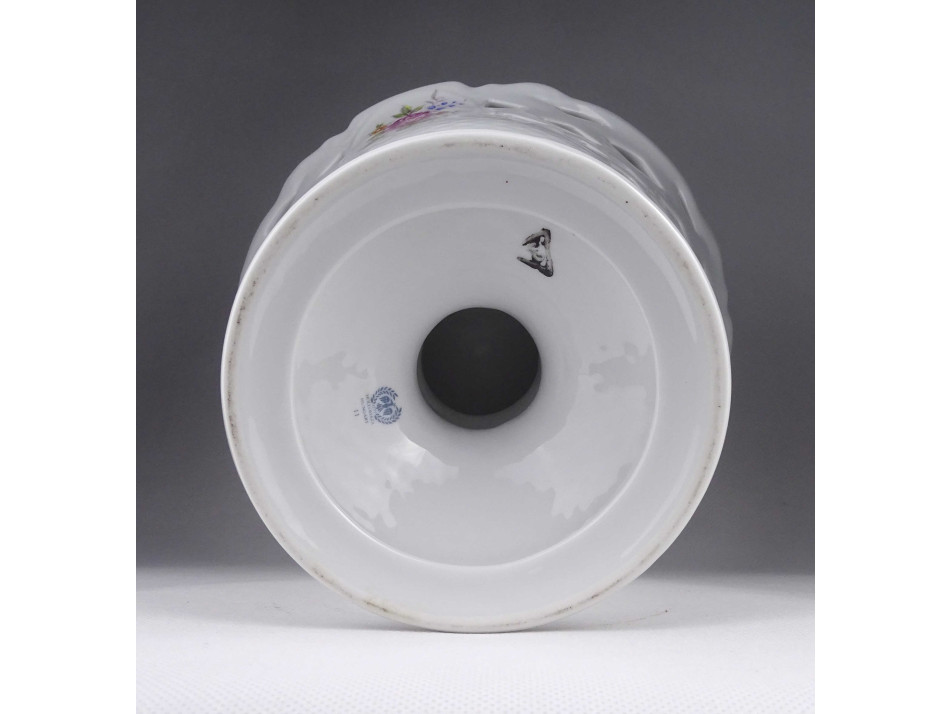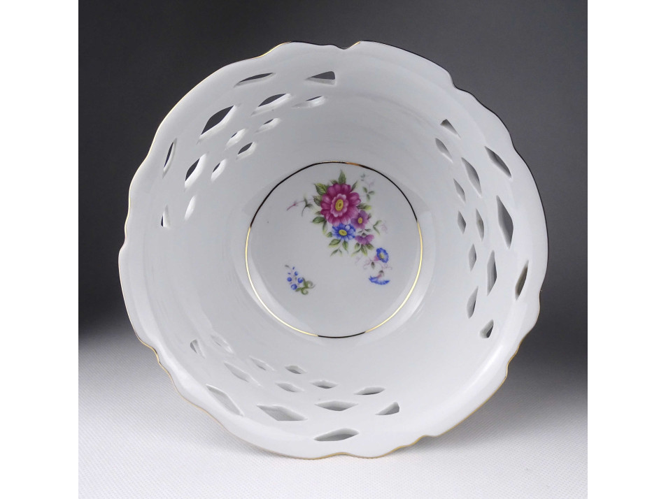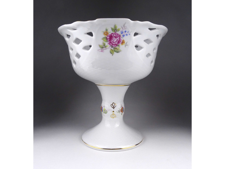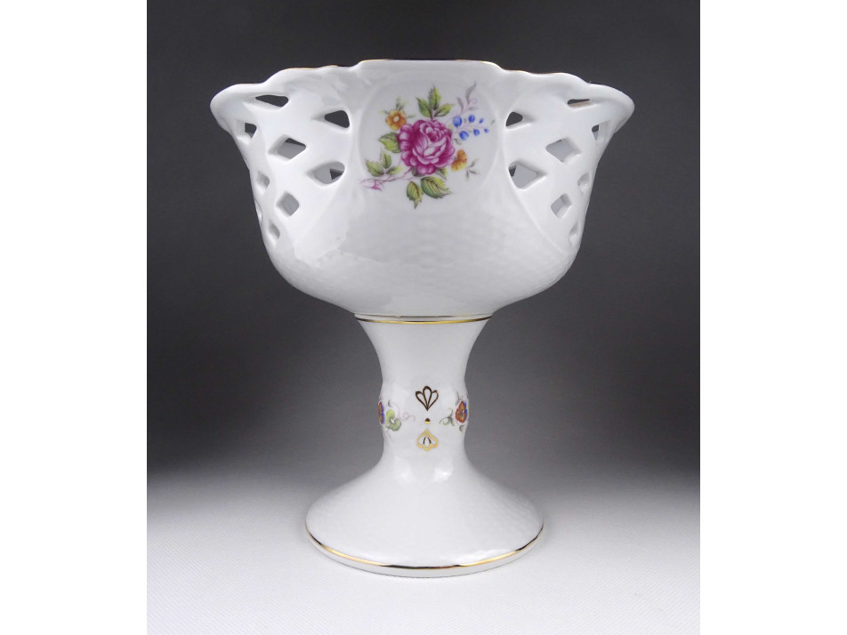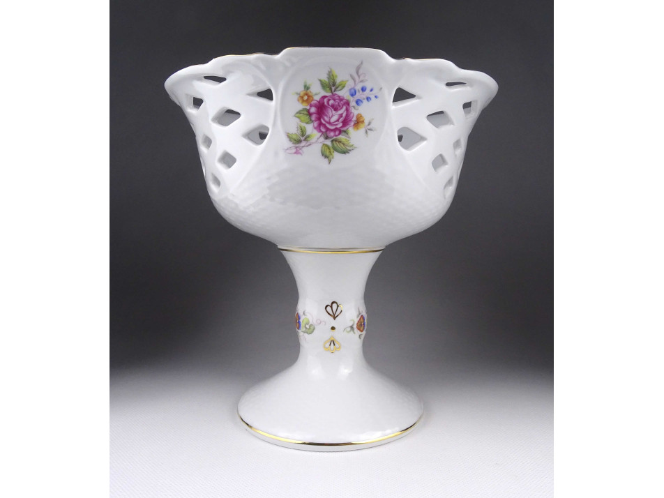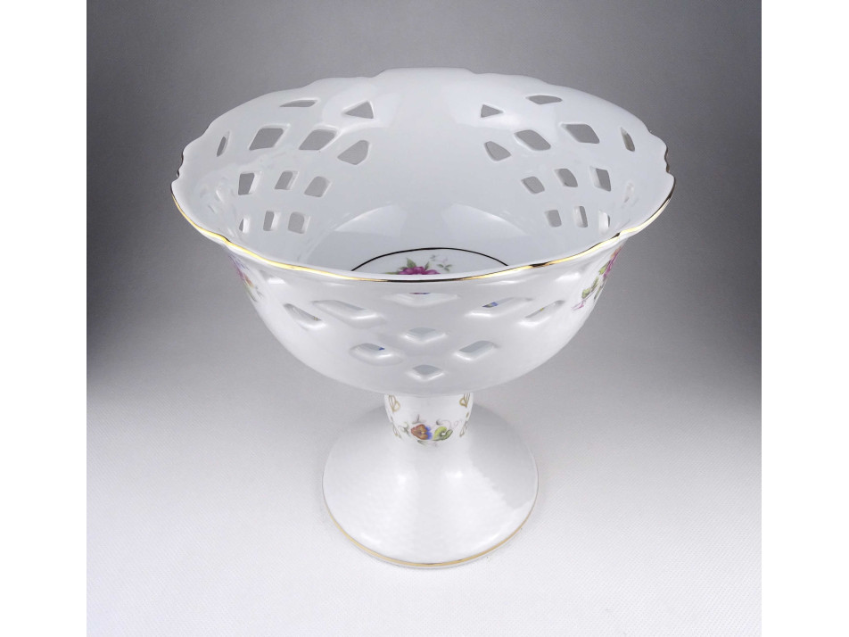 Hibátlan állapotú, gazdagon aranyozott nagyméretű talpas, áttört díszítéses, Hajnalka mintás Hollóházi porcelán asztalközép kínáló, gyümölcskínáló.