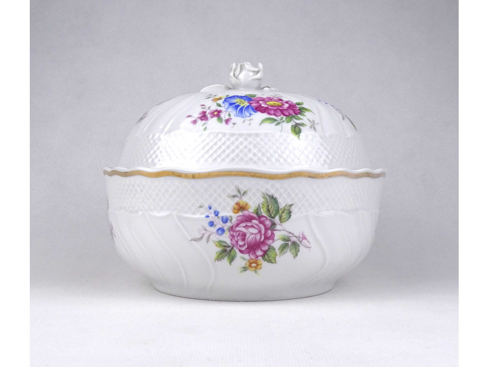 Hatalmas Hajnalka mintás, aranyozott-fehér Hollóházi porcelán rózsás bonbonier 17 cm
