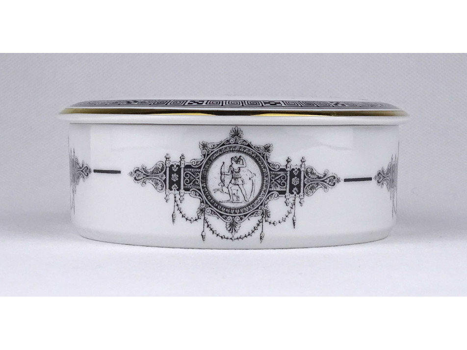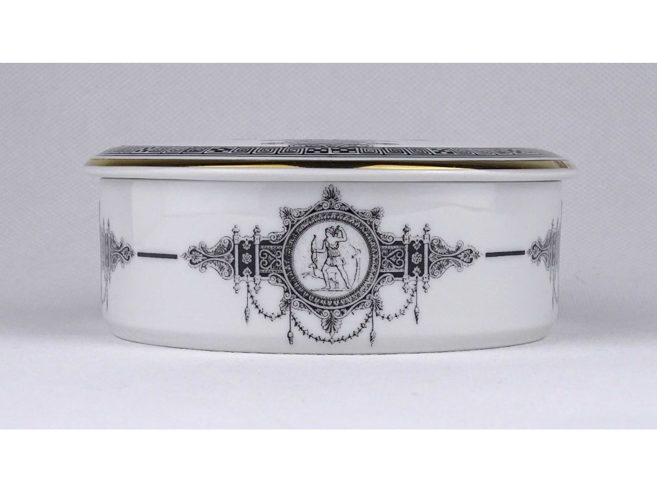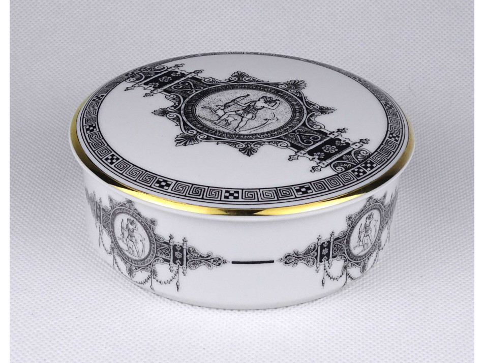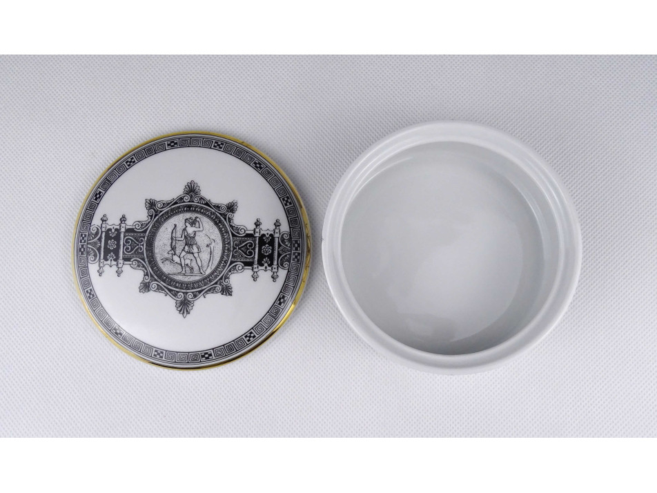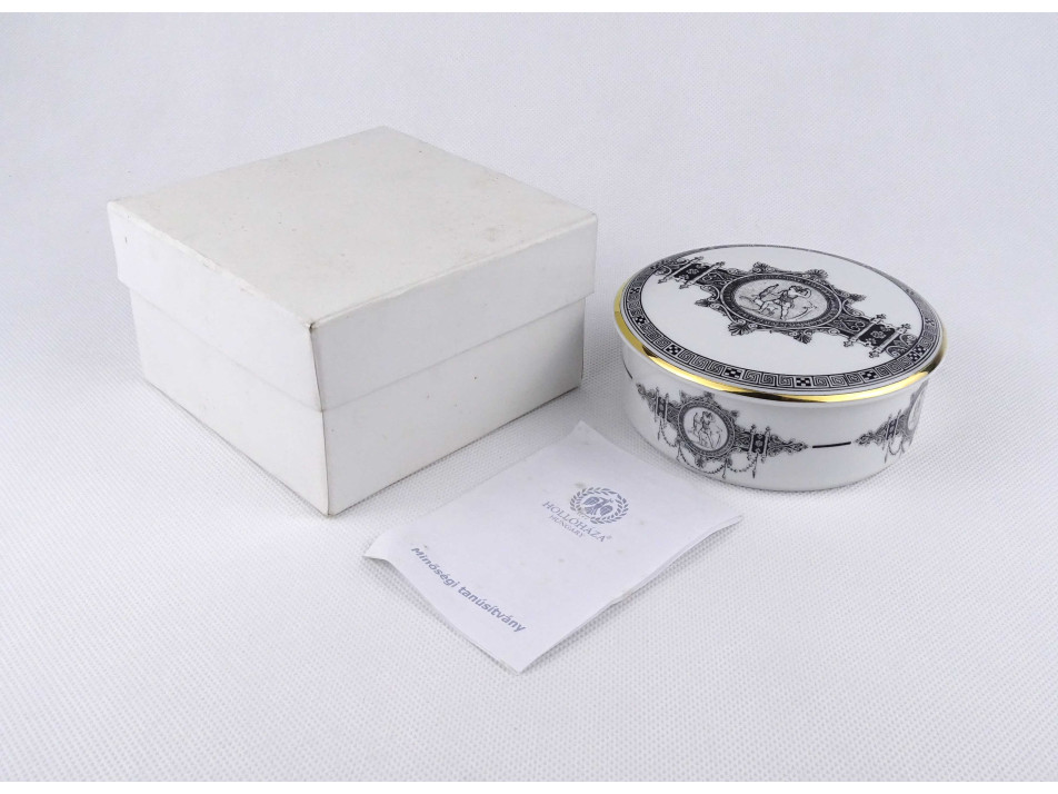 Hibátlan állapotú, Korintosz dekoros, fekete - fehér - arany, antik mintával és Artemisz istennő ábrázolással díszített, jelzett, fedeles Hollóházi porcelán ékszertartó, gyűrűtartó bonbonier, porcelán szelence eredeti dobozában, minőségi tanusítvánnyal.