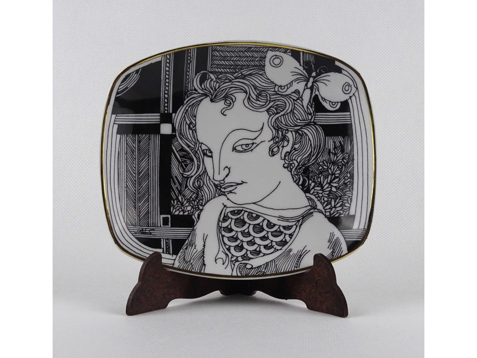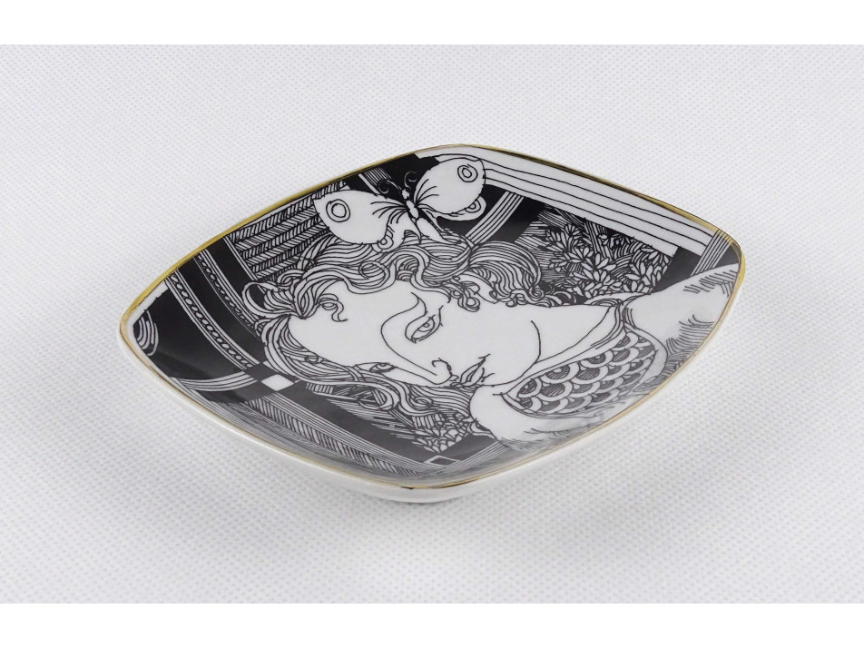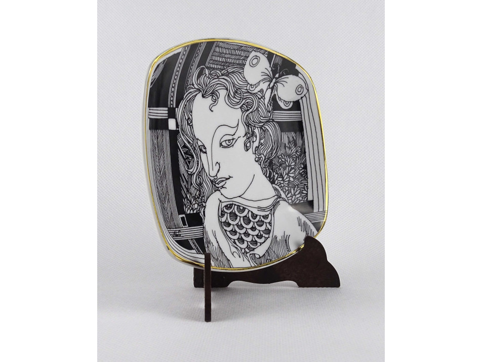 Hibátlan állapotú, 21 karátos arannyal, kézzel aranyozott, jelzett, porcelán hamutál, tálka. Rajta Szász Endre által készített női alak, pillangó motívum látható.