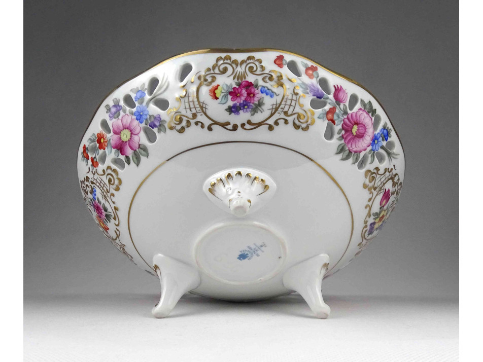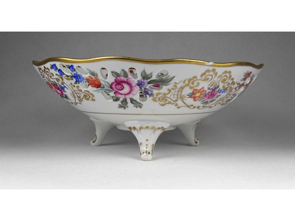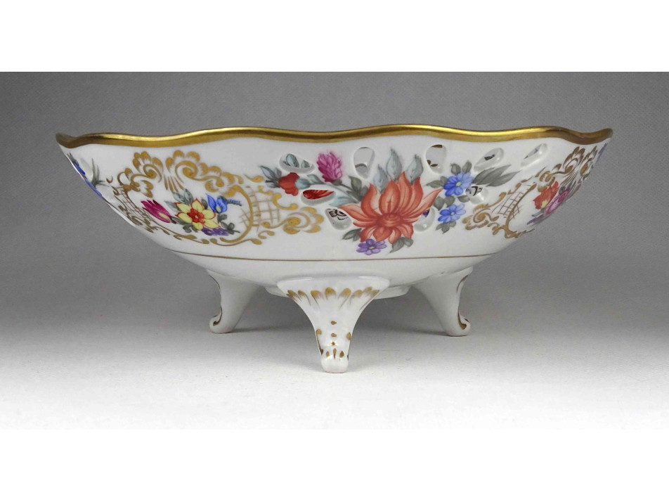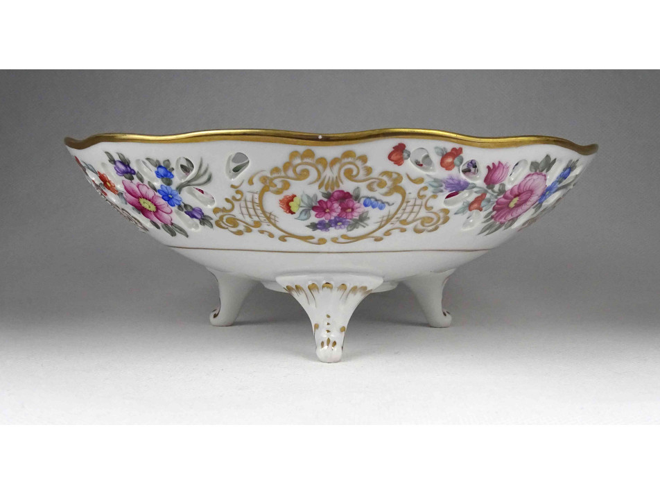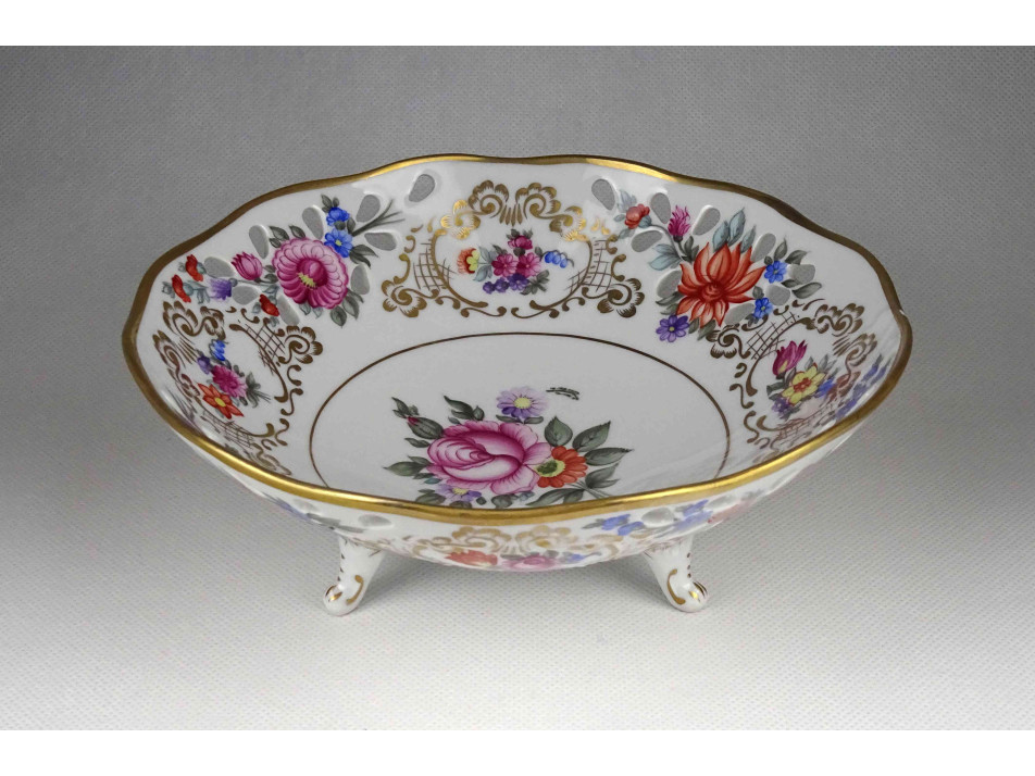 Hibátlan állapotú, jelzett, virágcsokor mintás, aranyozott peremű, áttört szélű, három lábon álló Hollóházi porcelán dísztál, kínáló tál, asztalközép kínáló.