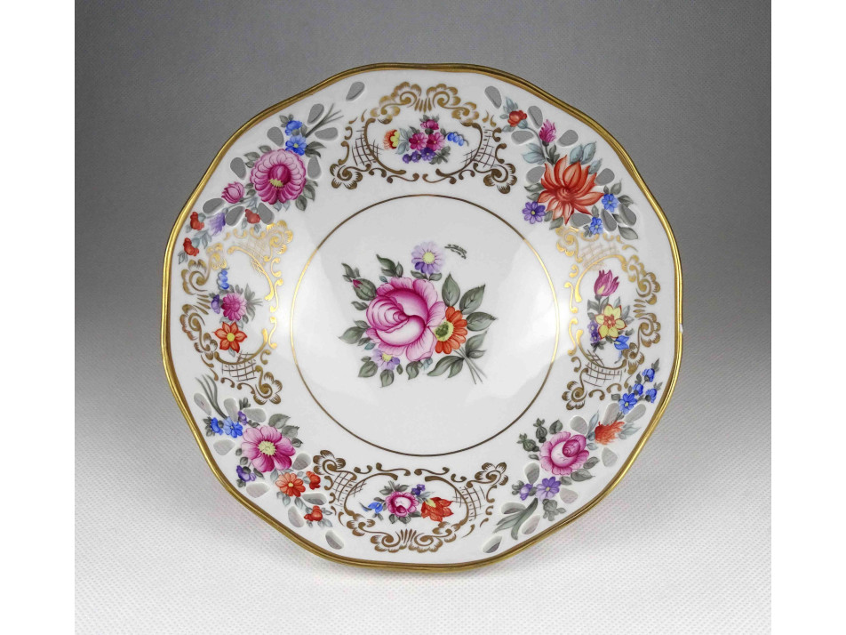 Virágcsokor mintás áttört szélű Hollóházi porcelán lábas dísztál 20 cm