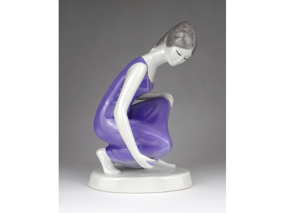 Hibátlan állapotú, jelzett, talapzaton álló, lila ruhás nő Hollóházi porcelán szobor, kezében tálkával.
