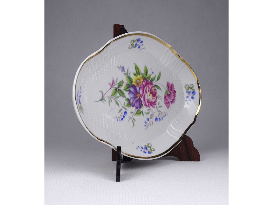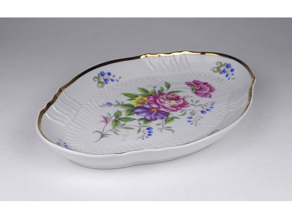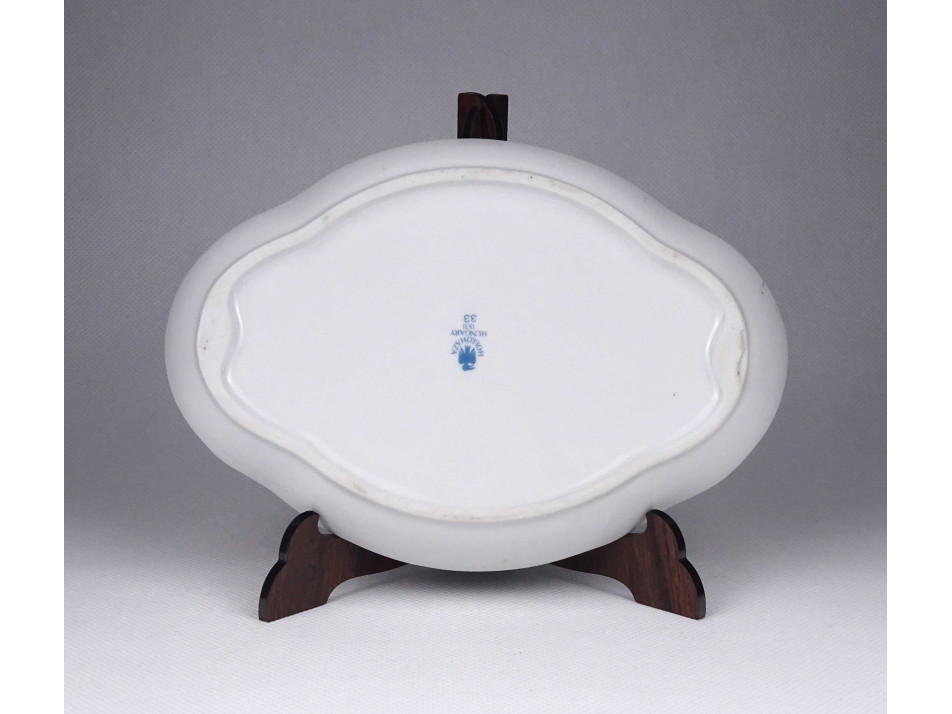 Hibátlan állapotú, jelzett, Hajnalka mintás, aranyozott szélű, Hollóházi porcelán ovális alakú kínáló tál, tálka, névjegykártya tartó.