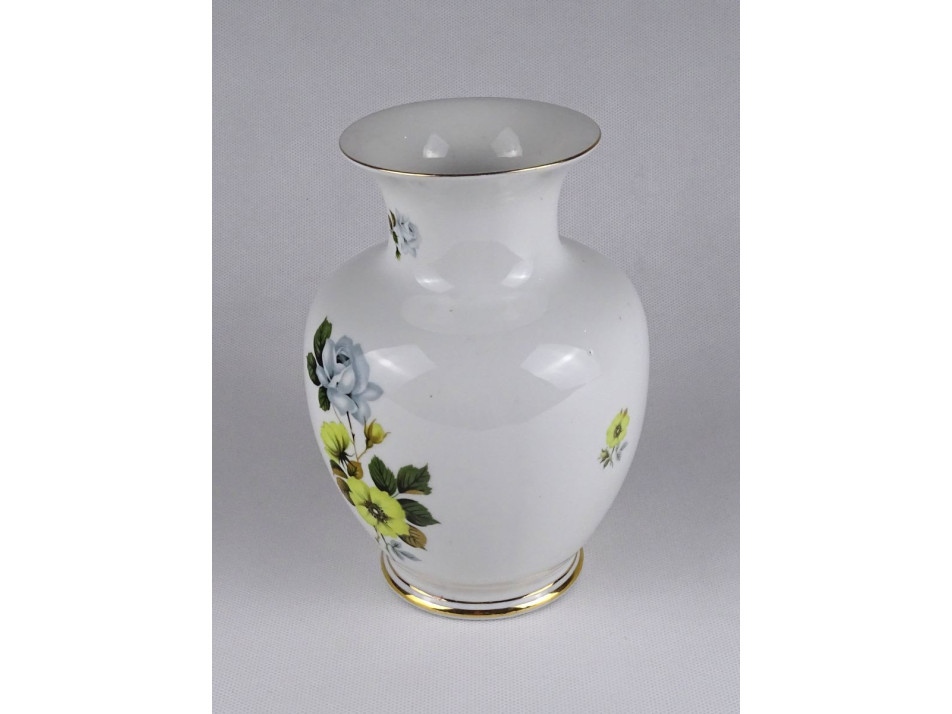 Szép állapotú, virágdíszes, pereménél aranyozott, Hollóházi porcelán váza.