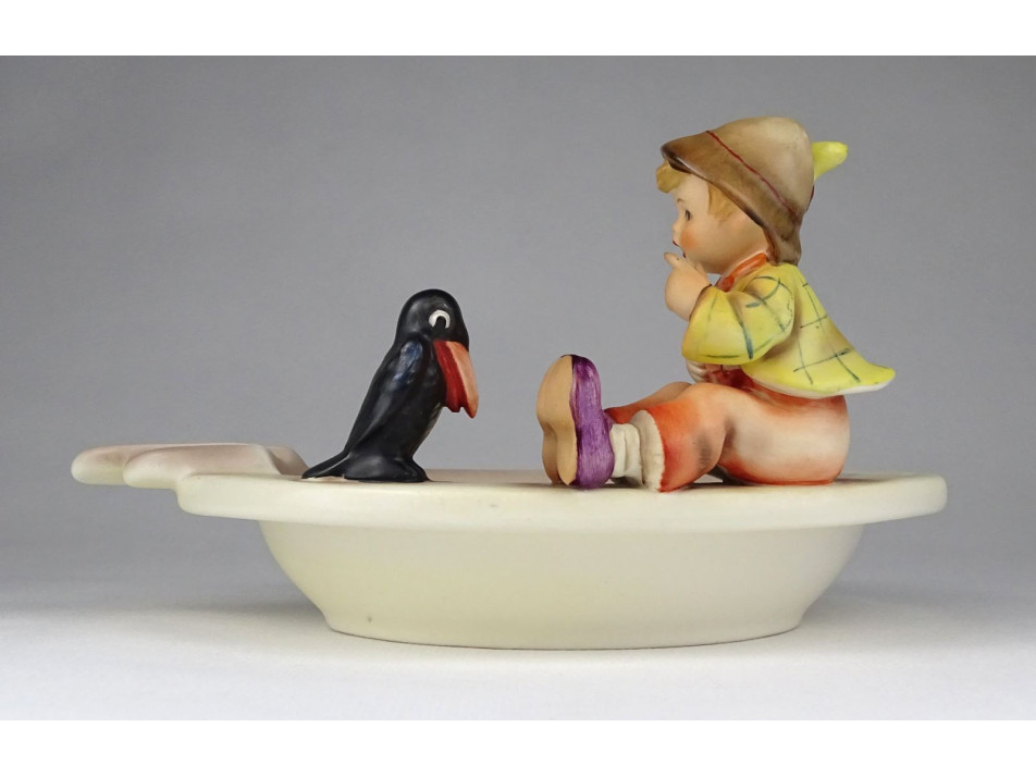 Régi hibátlan Hummel porcelán hamutál. Peremén kalapos kisfiú hollóval.