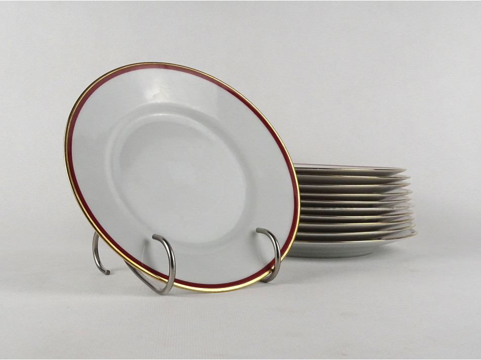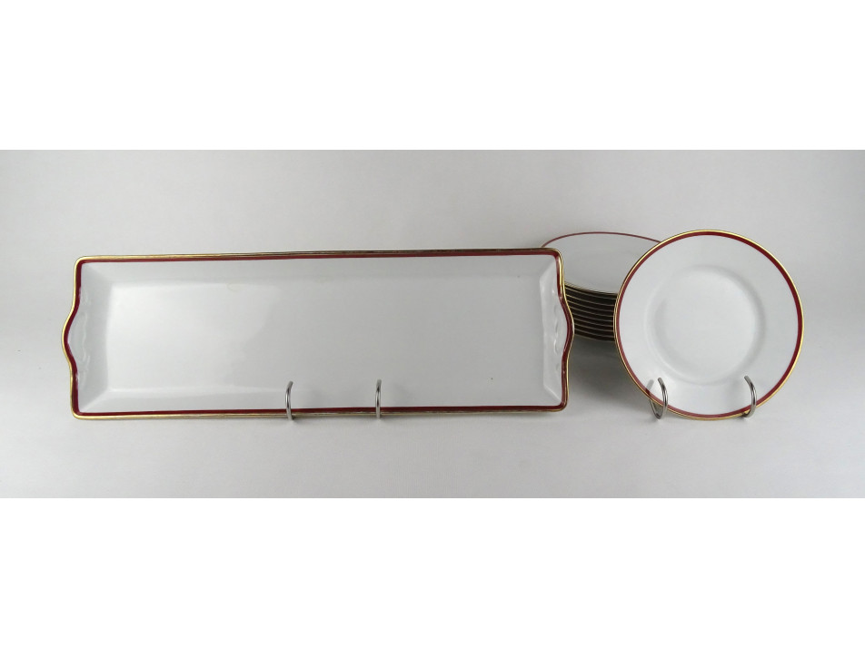 Régi szép állapotú, duplán jelzett, szépen aranyozott, fehér - piros porcelán süteményes készlet.